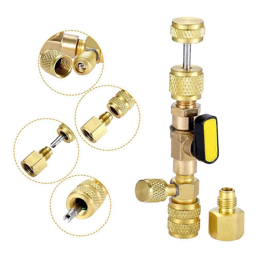 R410A R22 Peeler Valve Agent Removal Tool Assembly Tool Air Conditioner Repair Tool With Dual Size SAE 1/4 Inch 5/16 Inch Port For HVAC System Feature:1. For removing and installing reels in live systems. Quick and easy replacement of leaking spools. Double size for R410a or R22 charging systems or other retrofit systems.2. Excellent workmanship: Peeler Valve Center Remover installation tool is made of solid brass, which is durable and not easy to rust; The metal knob is designed with anti-slip knurling, which is durable and can be used for a long time.3. Time-saving: basic tool, easy inner valve insertion, core control, no need to stop or release refrigerant, easy to disassemble and install the valve core, save hours of draining and charging. Specification:Items: Reel Removal Tool, R410a Reel Removal Tool, R22 Reel Removal Tool, a/c Reel Removal Tool, HVAC Valves, Reel Remover, Schrader Remover Tool, Pressurized Small Split System Refrigeration Air Conditioning. Service Ports: 1/4 inch and 5/16 inch female SAE thread Bypass Port: 1/4 inch male SAE thread Color: Yellow Material: Copper Package Size: About 180*115*30mm/7.09*4.53*1.18 inch Basic Operation of Valve Core Remover Key:1. Pull out the dead center on the valve stem, close the valve on the tool, adjust the connection between the tool and the air conditioner interface, and tighten the valve on the air conditioner.2. Make sure the tool is tightly connected to the air conditioner valve, then open the valve on the tool. Push the valve stem into the air conditioning valve and gently turn the rear remover knob. Find the angle at which the spool is attached and release it.3. After removing the valve core, pull out the valve stem, close the valve on disassembly, loosen the screw at the end of the tool, and remove the valve core. Get the work done! Note: It is recommended that you close the reel key valve and disconnect the internal connection of the air conditioner before removing the reel. Due to the different monitor and light effect, the actual color of the item may be slightly different from the color showed on the pictures. Please allow 1-2cm measurement deviation due to manual measurement. 1 * Remover Installer1 * Remover Remover10 * Reel