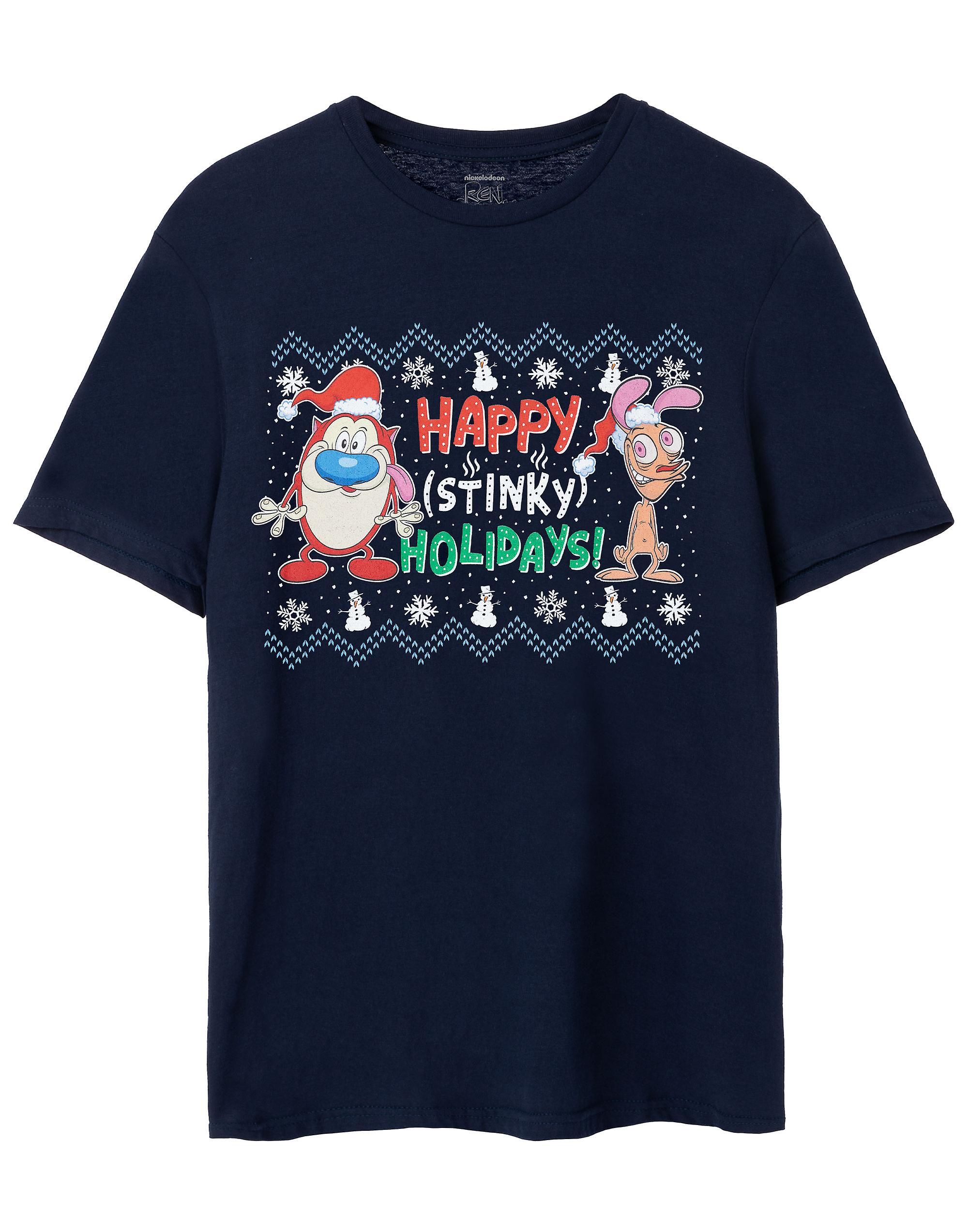 Ren & Stimpy Mens Short Sleeved T-Shirt Blue Happy Stinky Holidays