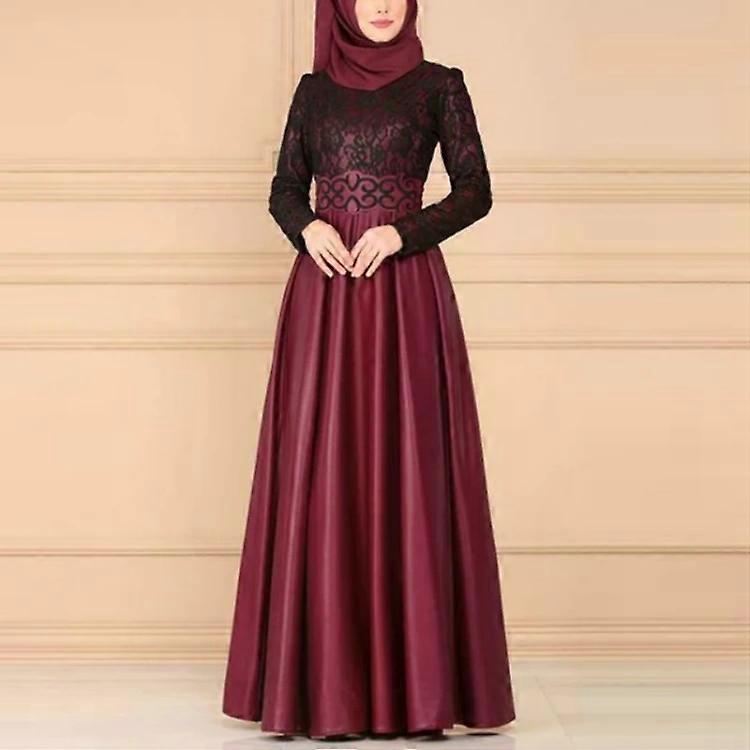 Retro Lace Stitching Swing Dress-Long-Sleeved Slim Fit,Ethnic Style,M Red Red,M