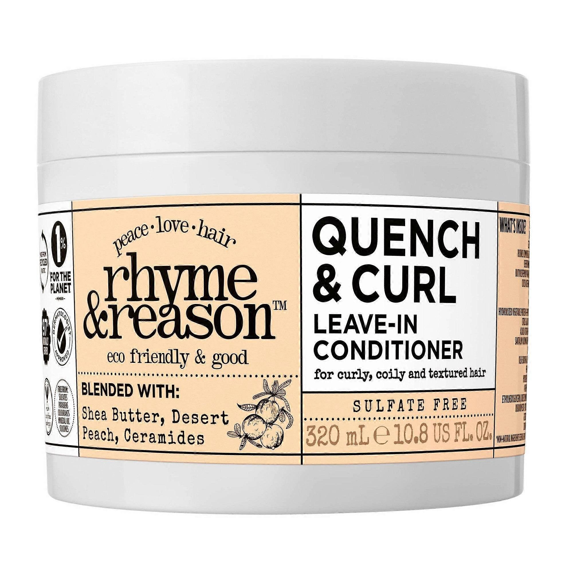 Rhyme & Reason is an eco-friendly haircare brand and we are as passionate about the planet as we are about amazing hair. Rated 10/10 for performance, Quench & Curl Leave In Conditioner is 97%+ naturally derived and formulated for those with curly, coily and textured hair. Revives thirsty curls with some serious hydration for healthy, defined and smooth shapes. For those with natural curls or coils that want to keep their curl defined, smooth and fabulous. Blended with Shea Butter to add and lock in moisture, Desert Peach and Ceramides known to improve the condition of the scalp and anchor roots, leaving curls happy, healthy and bouncy. Fragranced with peach & clove, cinnamon bark & heliotrope, tonka bean & sandalwood. All packaged in our eco-friendly 100% recycled tub. UPC: 5016155251551 Weight: 1 lbs