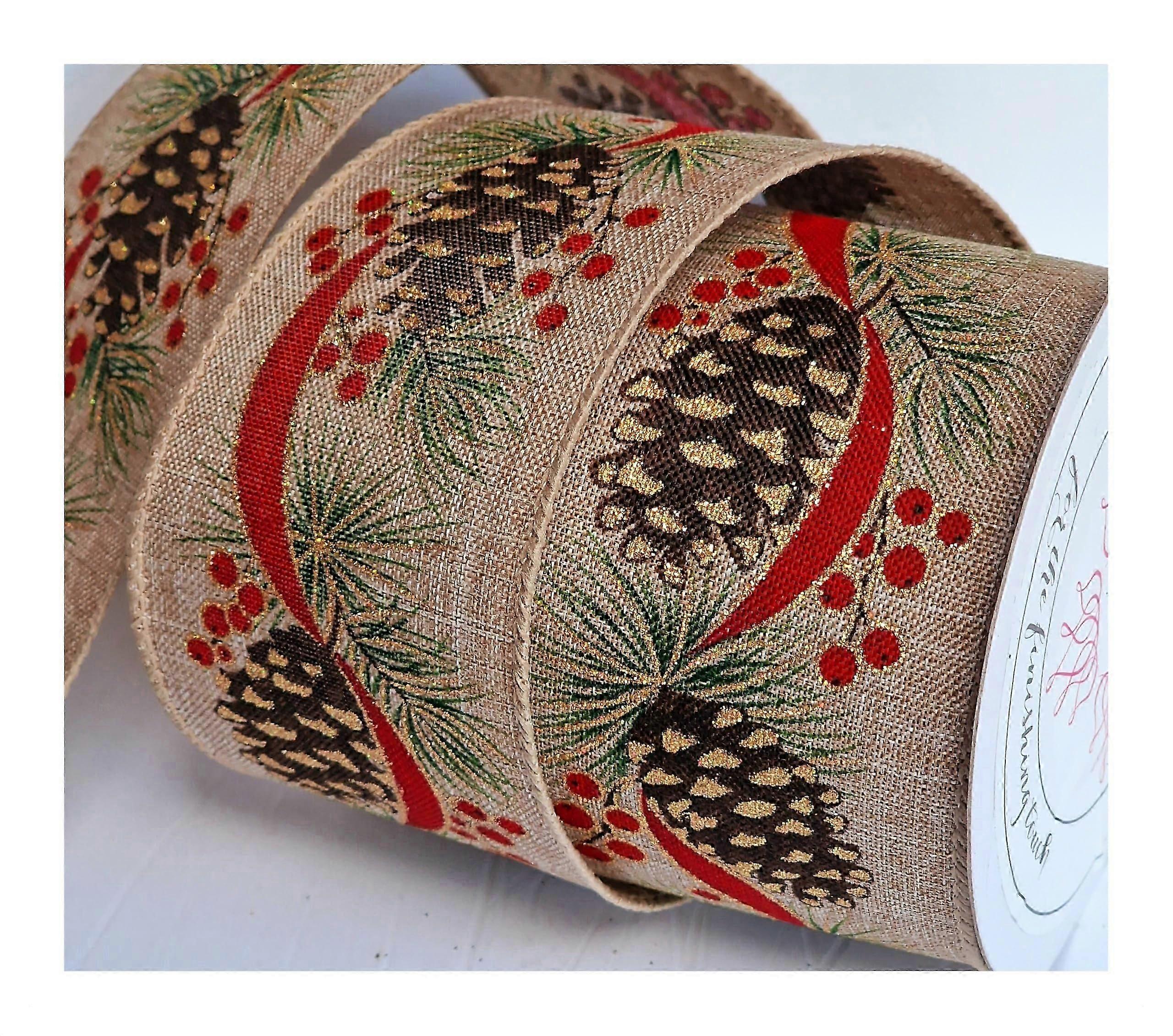 Ribbon Queen 2.5" 25 Yards Vintage Christmas Pinecone Wired Edge Jute Ribbon