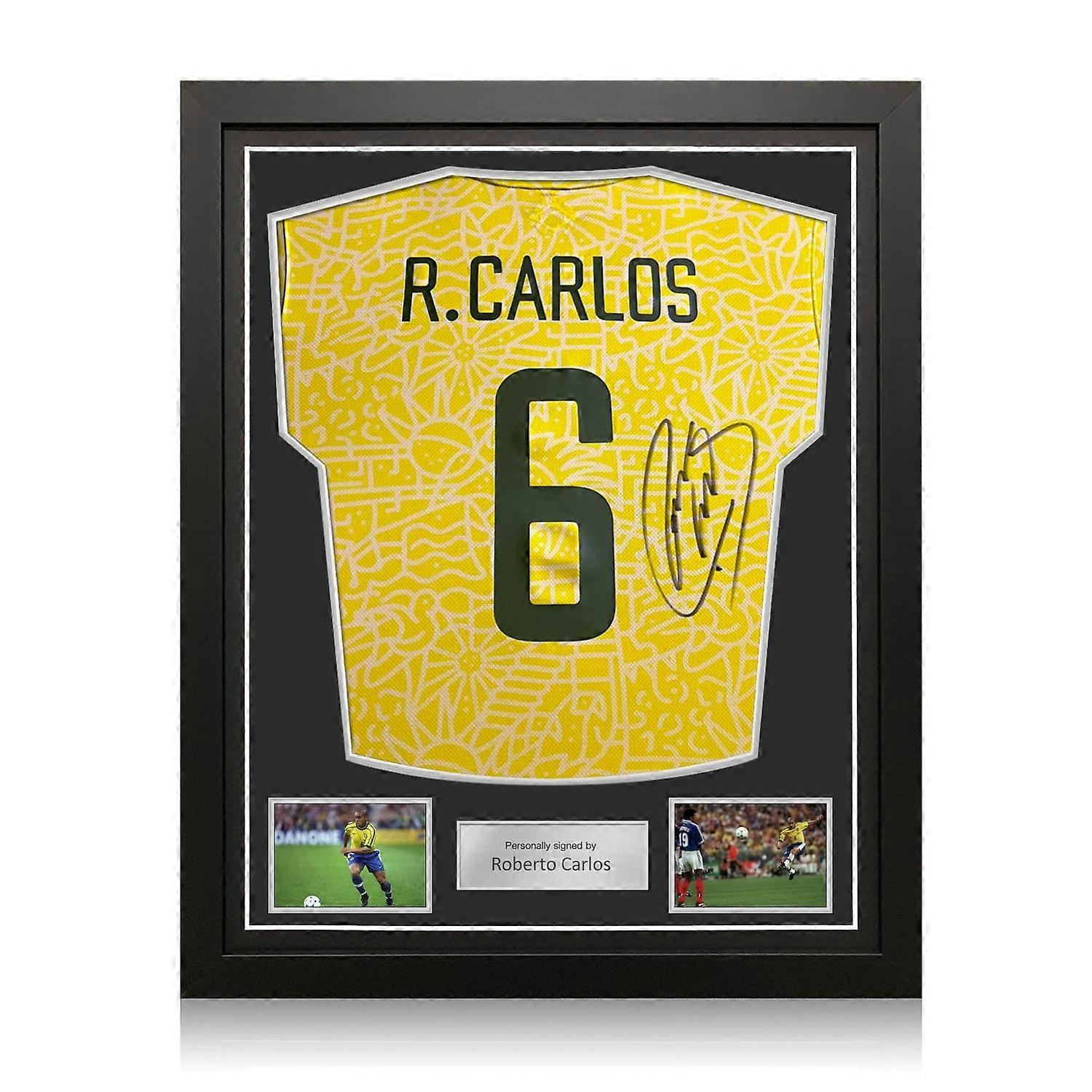 Official Brazil 2024 home football shirt, fan style printing, signed by Roberto Carlos. In standard black frame. Approximate size: 840 x 670 mm / 33 x 26.5 inches / This Brazil football shirt was signed by Roberto Carlos on July 23, 2025 in Madrid. Roberto made 125 caps for Brazil between 1992–2006. He played in three World Cups, helping Brazil reach the final in 1998 and win the tournament in 2002. All signatures are originals they are never printed. The product image is a stock photo so the position of signatures might vary slightly. Exclusive Memorabilia unconditionally guarantees all signed items are genuine. The item will come with a certificate of authenticity featuring a numbered hologram that matches an identical hologram affixed to the product. Exclusive Memorabilia is the UK's most trusted brand of sports and entertainment memorabilia, supplying Premiership football clubs, leading cruise lines and charities with their memorabilia for sale and auction.