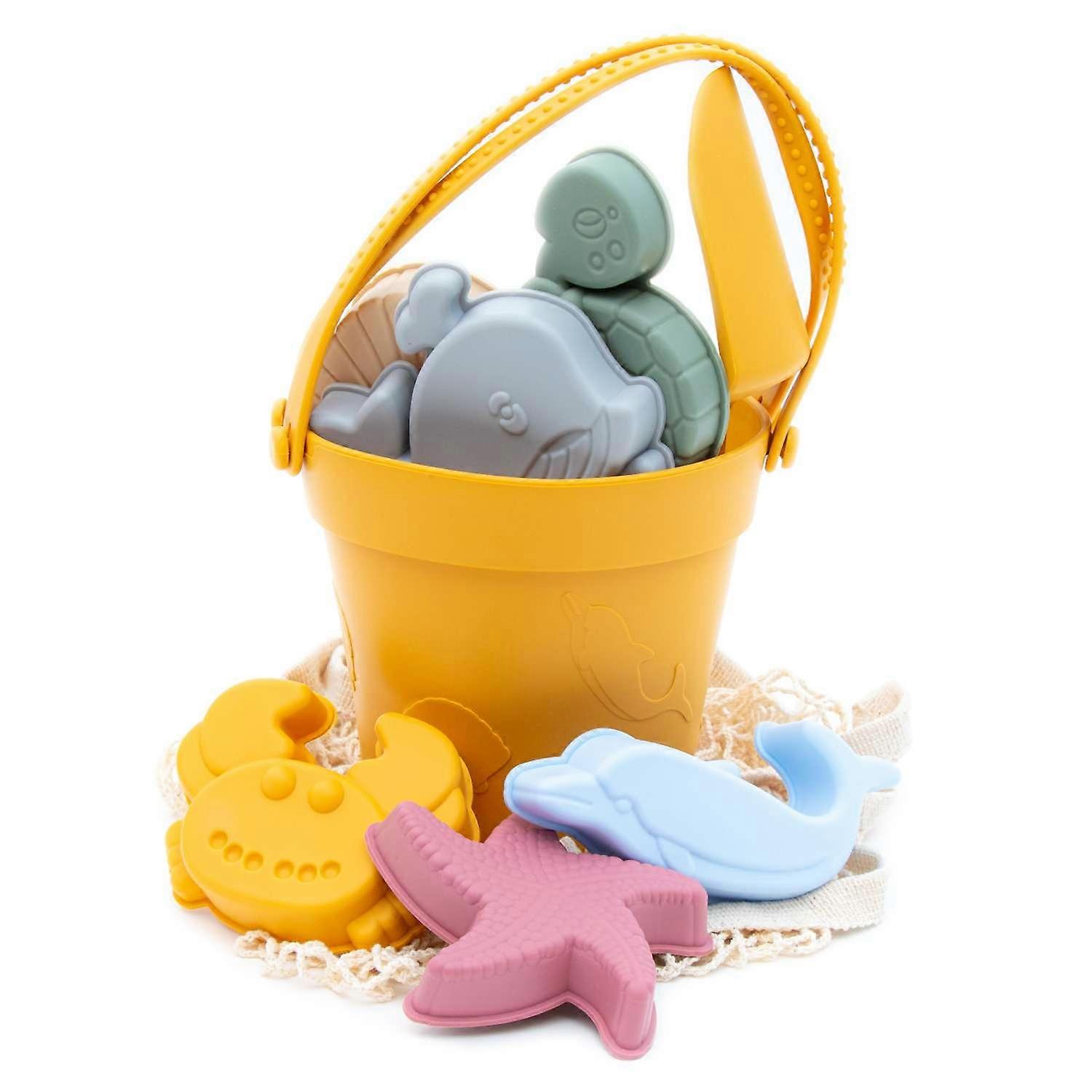 Sandkasten Spielzeug Set aus Silikon 15.5 x 14 cm - Strand Spielzeug für Sandkasten mit 6 Förmchen Eimer Schaufel und Tragetasche Netzbeutel für Mädchen und Jungen (9-tlg.)