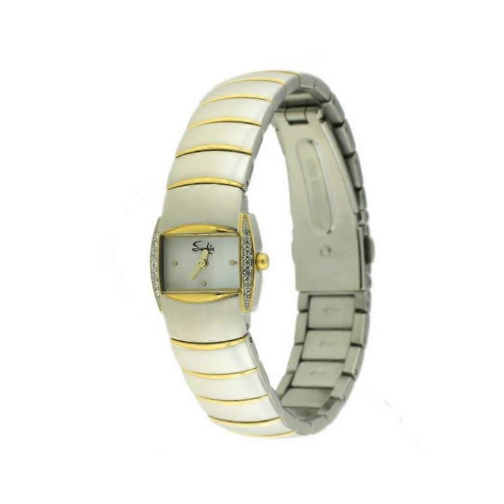 Beautiful bracelet watch from Saphir. Gold tone rims on the face and strap with side stones encrusted on the case face. Three gold tone hour points and gold tone hands. Perfect everyday watch.