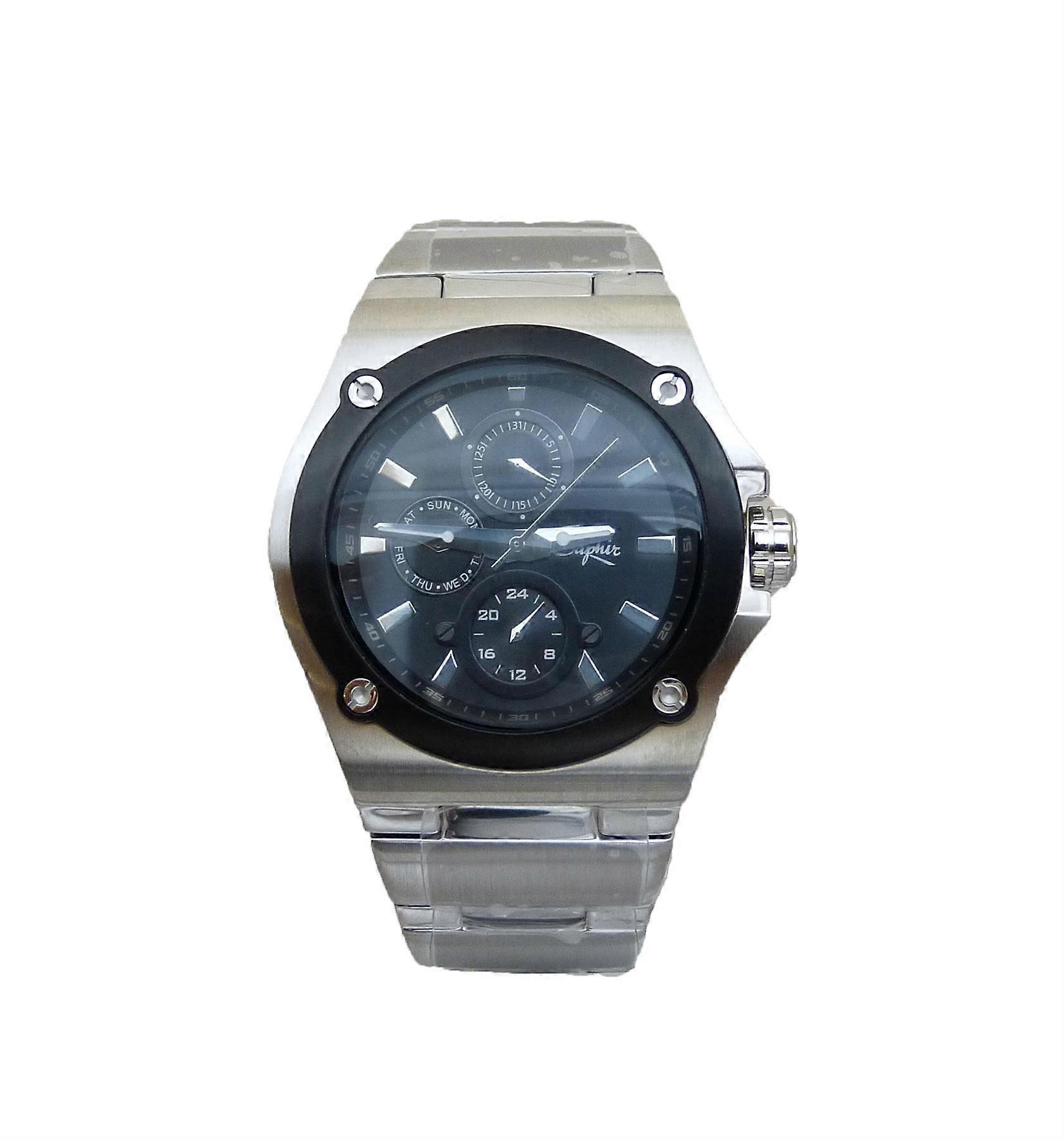 Stunning combination colour on this Saphir men's watch. Striking silver black contrast with the silver hands and dials. Three sub dials for day, date and hour in 24 hour format.