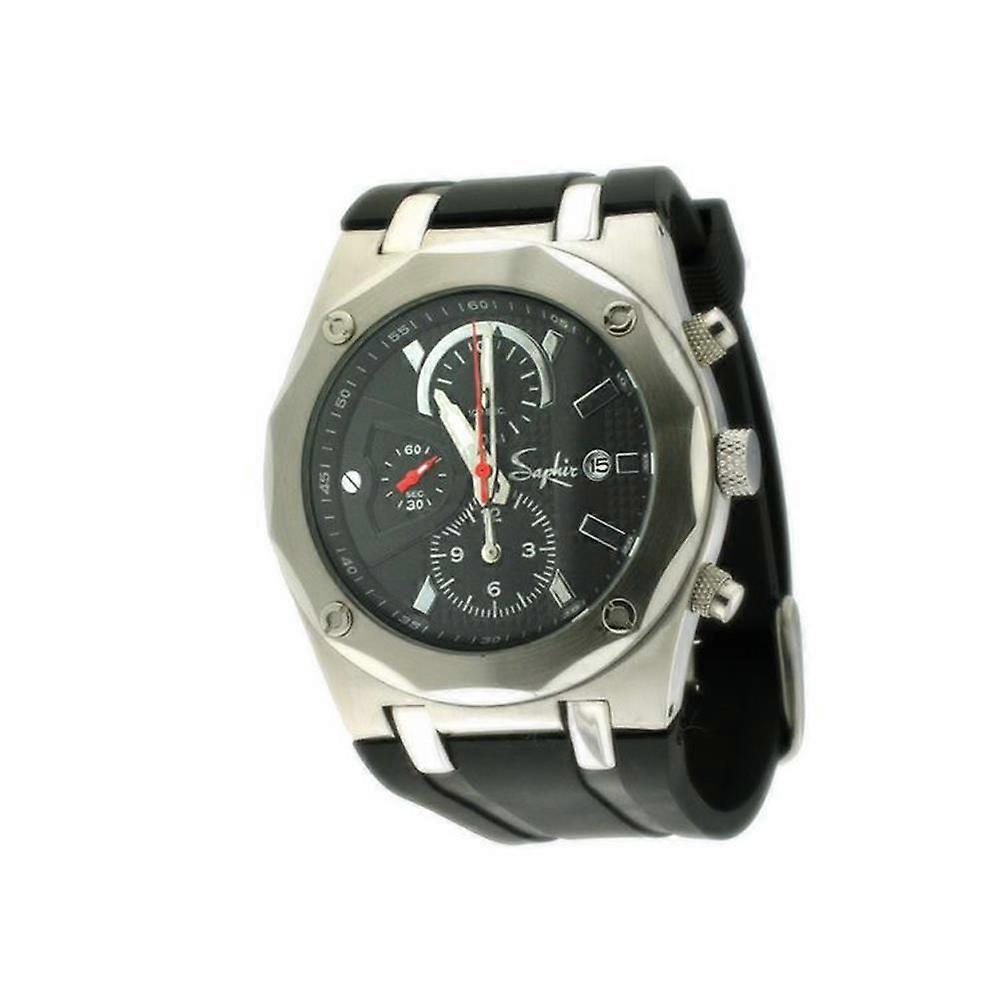 With this stunning classy watch Saphir show why they are at the forefront of todays fashion trends. A lovely round ridged black face with date dial, dual time, luminous hour hands and complimented perfectly by the black rubber strap. The perfect choice for anyone who is looking for a unique quality timepiece. Warehouse clearance - must go
