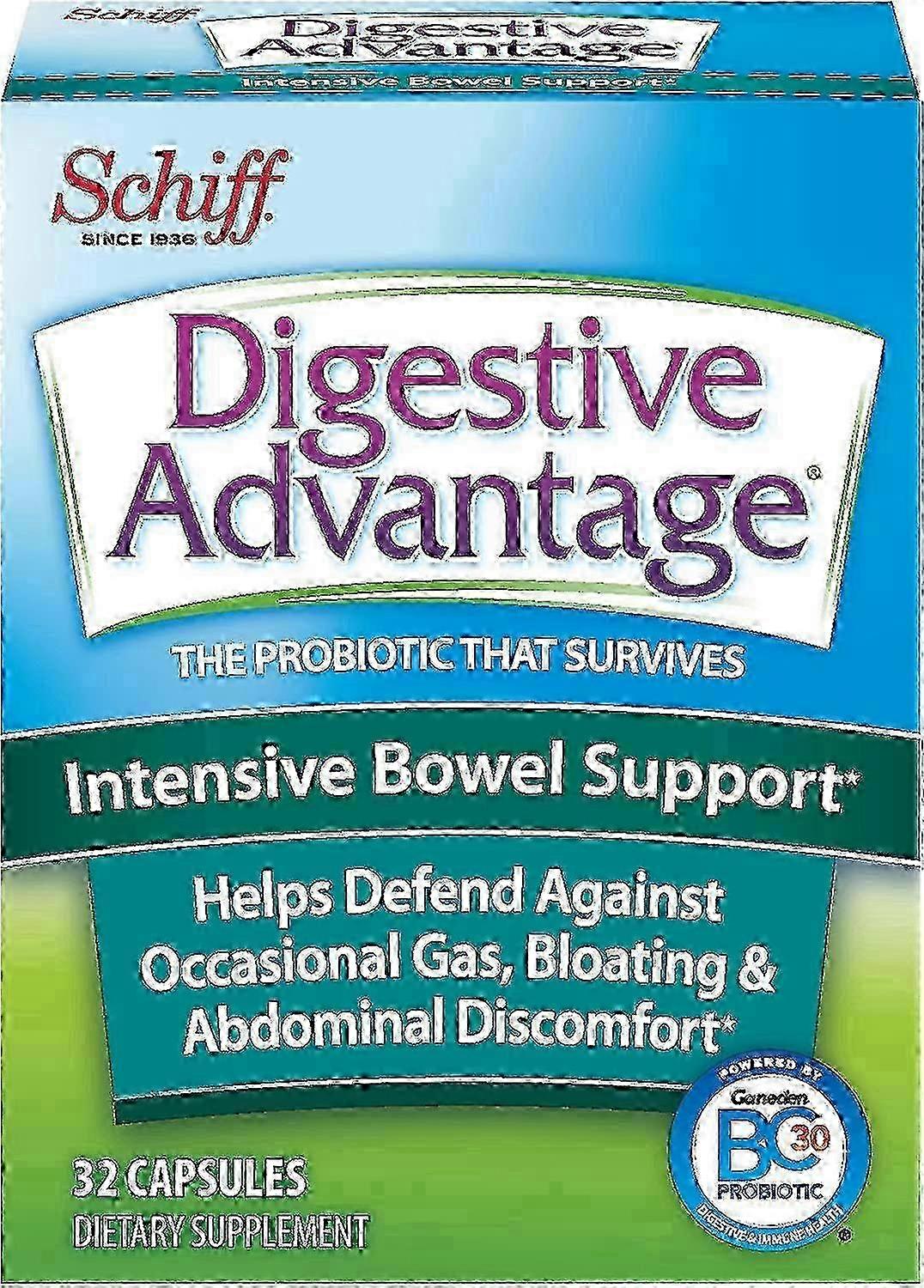 Dietary Supplement Helps Defend Against Occasional Gas, Bloating & Abdominal Discomfort The Probiotic That Survives 10x Better vs. Yogurt New Look ~ Same Great Product Enjoy the Benefits Supports Long-Term Digestive Health with Continued Use Probiotics Supplement That Survives 10 Times Better Than Yogurt Helps Defend Against Symptoms of Occasional Digestive Upset, such as Gas, Bloating, Abdominal Discomfort, & Diarrhea Adds Healthy Microflora to the Digestive Tract Supports Immune Health Digestive Advantage Intensive Bowel Support is a probiotics supplement with BC30 probiotic and digestive enzymes to defend against occasional digestive upsets such as gas, abdominal discomfort, and bloating;It also helps support long-term digestive health. Digestive Enzymes Relieve Occasional Bowel Upset. With continued use, the probiotics in Digestive Advantage Intensive Bowel Support promote long-term digestive health;In the short term, the enzymes in this formula can lessen abdominal discomfort such as gas, bloating, constipation, and occasional diarrhea. ^. Studies show that BC30 probiotics and digestive enzymes break down proteins, carbohydrates, and fats to aid the digestive process;As a result, it helps defend against occasional gas, bloating, and abdominal discomfort. BC30 Survives 10 Times Better^. Your digestive system is home to 10,000 microbial species or microflora, both beneficial and otherwise. Probiotics are good microflora, usually living bacteria but also yeast and other organisms, that help maintain a healthy microbial environment and help keep your digestive system happy. Many other probiotics don't survive the harsh acidic stomach environment and are destroyed;BC30 (Bacillus coagulans), the unique strain of bacteria in Digestive Advantage has a naturally occurring protective shell surrounding each cell, so it can withstand the harsh acidity of your stomach;With a survival rate 10 times higher than other probiotics, including yogurt, BC30 is better able to reach your intestines alive and promotes a healthy digestive tract. ^. Supports Immune Health. The health of your immune system is impacted by your digestive health;In fact, 70 percent of the immune system is physically located in the digestive tract;As a probiotic, BC30 has been shown to support healthy immune function. Schiff Digestive Advantage targets your specific digestive health needs and, with continued use, gives you long-term digestive support. That's because Digestive Advantage contains BC30, a natural probiotic that survives 10x better than yogurt to deliver good bacteria where you need it. ^ Digestive Advantage Intensive Bowel Support defends against occasional diarrhea and other digestive upsets such as gas and bloating. Studies show that BC30 probiotics break down complex carbohydrates that, if undigested, may trigger occasional abdominal discomfort. Probiotics are beneficial bacteria that live in your digestive tract and promote digestive and immune health;Many other probiotics don't survive the harsh acidic stomach environment;Because Digestive Advantage Intensive Bowel Support reaches your intestines alive, it is able to provide digestive and immune health benefits where you need them. Powered by Ganeden BC30 Probiotic | Digestive & Immune Health.