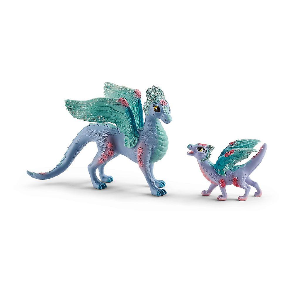 The beautiful flower dragon mum and her sweet baby by Schleich bayala live in the wide meadows of the dazzling bayala world. The baby dragon found the flower unicorn foal as a friend to play with and the two love to frolic over the flower fields. The dragon mum and the flower pegasus watch them with great affection.In the wide meadows of the Schleich bayala world live the flower dragon mother and her cute child. There, the dragon baby has found a new friend to play with: The wild little flower unicorn foal. Together they romp around and have a lot of fun. Sometimes Marween and Piuh come by and then they all frolic together through the flower fields, while the flower dragon mom and the flower pegasus watch them.