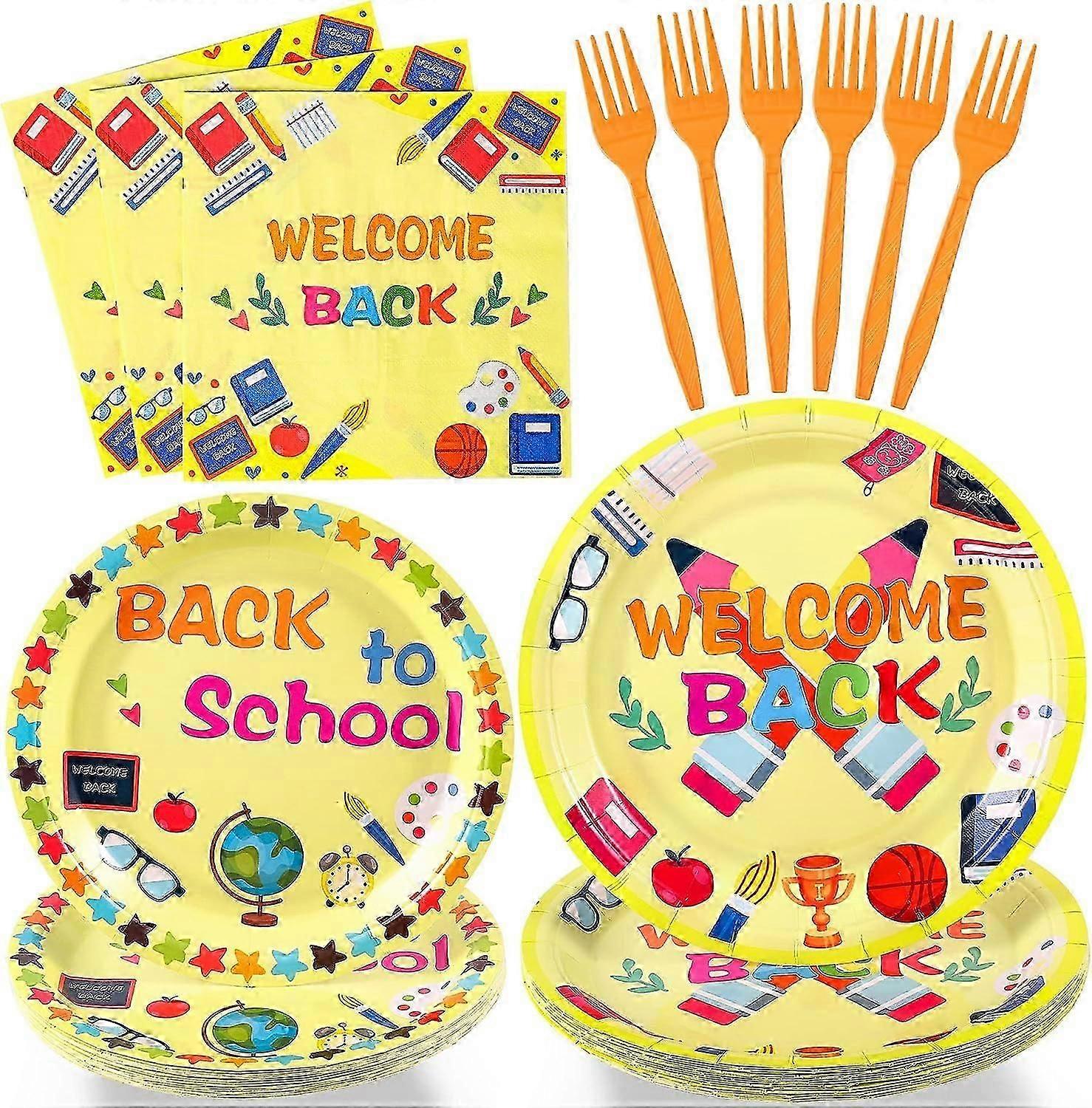 Back to School Party Decorations Serves 24 People Guests:You will receive paper tableware set include 24pcs back to school party paper dinner plates of 9, 24pcs pencil paper plates of 7, 24pcs party napkins of 6.5 and 24 plastic forks, each set can serves 24 guests. It is a excellent choice for anyone looking to host a memorable back to school themed event.Premium Material School Party Supplies: All of our back to schooltheme plates and napkins are made of high quality paper, non-toxic, no smell, heat-resistant and durable. The napkins made from 3-ply paper, making them sturdy enough to wipe hands and clean up spills. The pattern and colors are well-printed and fade-resistant to provide you with a party full of school season theme atmosphere.VibrantBack to School Party Design: Except for the fork, this back to school theme party tableware set is all designed in yellow background and colorful pencil and book for kids. Patterns with welcome to schoolwords, full of school elements, these back to school tableware kit can make your party full of the school season atmosphere. You can create a great way to inspire learning atmosphere in these school table decorations with friends and classmates.Convenient and Easy to Enjoy Your Back to School Party: These easy paper plates and napkins party supplies are the perfect addition to your school themed party decorations. These disposable plate and napkins for party can saving your time in cleaning up. You just throw them out after the party so that you can enjoy more fun with friends and classmates in the school party supplies.Perfect Back to School Party Complement: These vibrant back to school theme supplies packs are a perfect complement to your back to schoolthemed party decorations. These party tableware kit have an enough quantity for a normal back to school theme big day especially for back to school lovers,school party favors. These back to school party decoration kit will make your table settings look fantastic and create a fantastic school season.96 Pcs Back to School Party Decorations Supplies School Season Party Tableware Set Welcome Back to School Party Plates Napkins Forks Disposable Paper Plate for 24 Guests Kids Party Favors96 Pcs Back to School Party Decorations Supplies School Season Party Tableware Set Welcome Back to School Party Plates Napkins Forks Disposable Paper Plate for 24 Guests Kids Party Favors