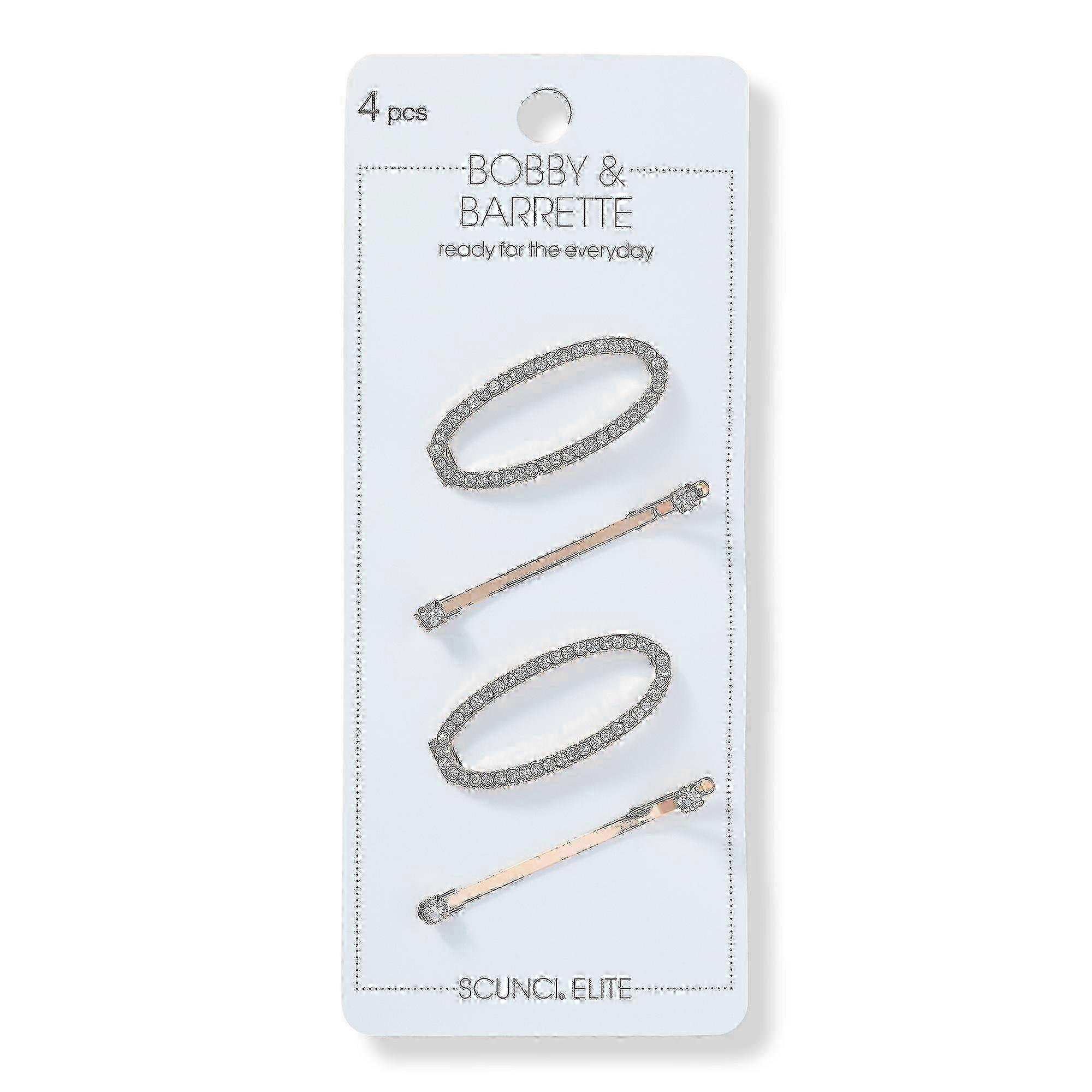 Stack the set of Scünci Elite Gold-Tone and Crystal Bobbies and Barrettes to add more flair to your hair Includes 2 oval clips and 2 straight pins. Features: 4-piece crystal barrettes: 2 gold-tone oval barrettes with crystals, 2 bobby slides with a single crystal accent Great for stacking or adding sparkle to your everyday style Product Packaging: Please note that some manufacturer may often change their packaging. This product may arrive different from what is pictured. We will always ship the most up-to-date packaging to our customers. Please contact us if you have any questions about this product or would like to request an older version of this product. UPC: 000002542963 Weight: 0.25 lbs
