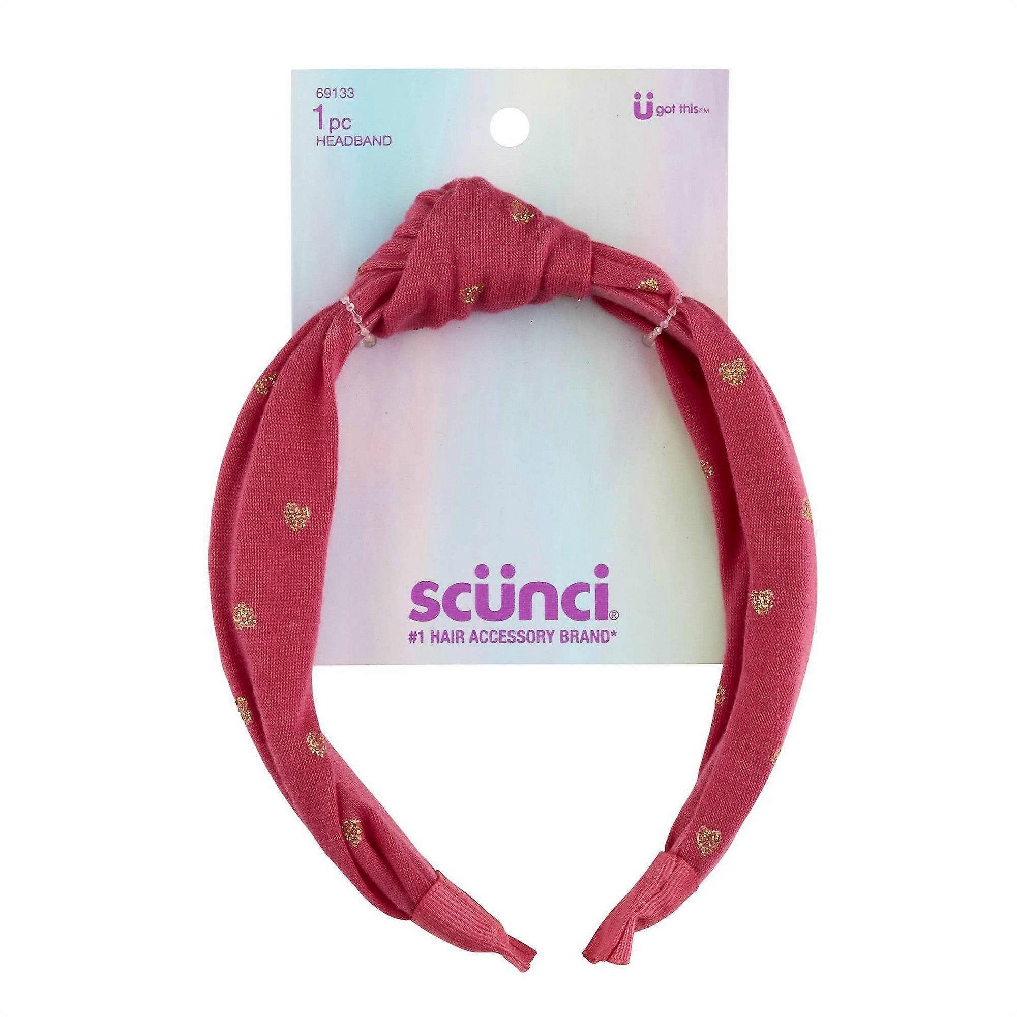 I heart headbands Transform messy hair into dressy hair when you slide on a pretty pink headband. This comfortable padded band is topped with a stylish knotted twist and accented with metallic gold hearts for an extra-sweet touch. Soft fabric lines the inside and ends of the band, protecting against pulls and pinching. Wear it alone or with a ponytail or braid to keep hair neat and add extra color to any outfit. About scünci hair accessories: When it comes to keeping your look on-trend, scünci has you covered with today’s hottest hair accessories, including stylish headbands, super-comfy scrunchies, glitzy bobby pins, glam barrettes, and much more. From work to workouts to nights out, scünci lets you express your personal style and gets you ready for any occasion. Take control of your hair and look amazing whatever you do and wherever you go. Whether bling is your thing or casual is your calling, with scünci, ü got this. UPC: 043194691333 Weight: 0.44 lbs