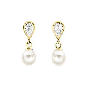Jewelco Londonin kiinteät 9 karaatin kultaiset päärynänmuotoiset makeanvedenhelmet ja kuutiollinen zirkonia, peilimäiset kaksinkertaiset pisaranmuotoiset korvakorut Jewelco London