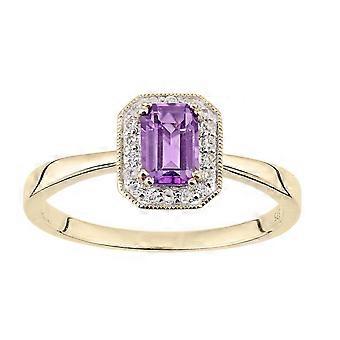 Jewelco London 9ct Keltakultainen kierros 8pts Diamond Octagon 0.55ct Ametisti Octagon Mill Grain Halo Cluster Ring