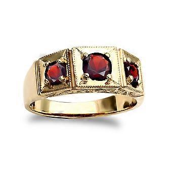 Jewelco London miesten vankka 9ct keltainen kulta pyöreä Brilliant Garnet 3-kivi trilogia veistetty mustalainen rengas