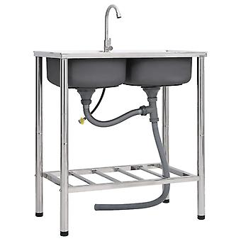 Retkeilyallas kaksinkertaisella pesualtaalla ja hanalla ruostumatonta terästä