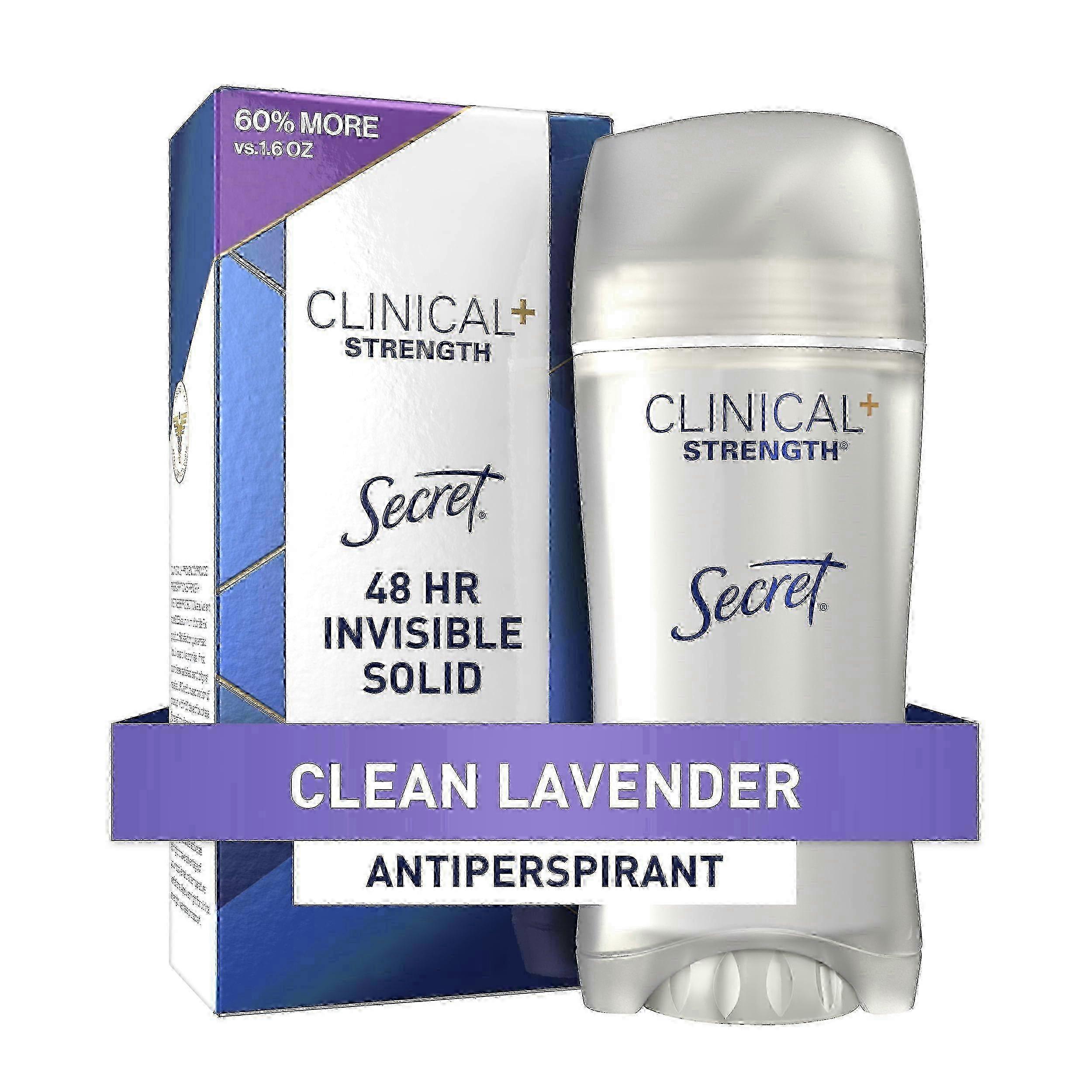 Secret Clinical Strength Invisible Solid is our best protection that goes on dry. It absorbs odor while releasing a scent to keep you smelling clean and feeling dry. Did you know that heat, activity and stress can all cause you to sweat and that stress sweat smells the WORST? That's because stress sweat comes from a different gland, causing more bacteria and more odorSecret Clinical Strength Invisible Solid incredible protection, no matter what the day may bring. 1 Clinical Strength Antiperspirant 2X Better Sweat Protection vs. the protection required of an ordinary antiperspirant 1 application, 0 reapplication, sweat protection for 48-hours Better sweat protection than a prescription strength antiperspirant** (*equivalent to a 6.25% aluminium chloride RX product *Secret Clinical Invisible Solid) Secret Clinical is the 1 selling clinical antiperspirant brand and winner of the 2016 Best Of Beauty Expert Award Enjoy the soothing aroma of lavender all day with Clean Lavender scent Secret Clinical Strength Invisible Solid Antiperspirant and Deodorant, Clean Lavender scent UPC: 037000889861 Weight: 0.57 lbs