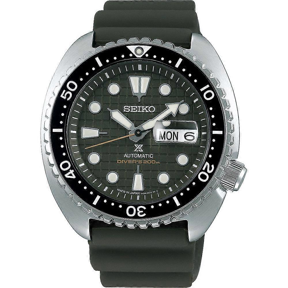 Seiko Watches Mod. Srpe05k1 Official BoxThe Seiko Prospex SRPE05K1, affectionately known as the "King Turtle," is a distinguished timepiece that merges Seiko's esteemed diving watch heritage with modern enhancements. Product Description: This watch showcases a textured green dial with a three-dimensional waffle pattern, encased in a robust 45mm stainless steel case. The unidirectional rotating bezel features a black ceramic insert, offering enhanced scratch resistance. Powered by the automatic Caliber 4R36 movement, it provides both day and date displays, visible through a magnified window at the 3 o'clock position. The watch is complemented by a comfortable green silicone strap, making it suitable for both diving adventures and daily wear. Key Features: Movement: Automatic Caliber 4R36 with manual winding capabilityCase Material: Stainless steel with a black ceramic bezelCase Dimensions: Diameter: 45.0mm; Thickness: 13.2mm; Lug-to-lug: 47.7mmDial: Green with a three-dimensional waffle patternCrystal: Sapphire with anti-reflective coating on the inner surfaceStrap: Green siliconeWater Resistance: 200 meters (20 bar)Functions:Day and date display with magnifierStop second hand functionLuminous Features: Lumibrite on hands and indices for enhanced visibility in low-light conditionsAdditional Features:Unidirectional rotating bezelScrew-down crown and case back for improved water resistance This watch is ideal for diving enthusiasts and individuals seeking a durable, stylish timepiece that embodies Seiko's legacy of quality and innovation. SpecificationValuePackagingOfficial Box
