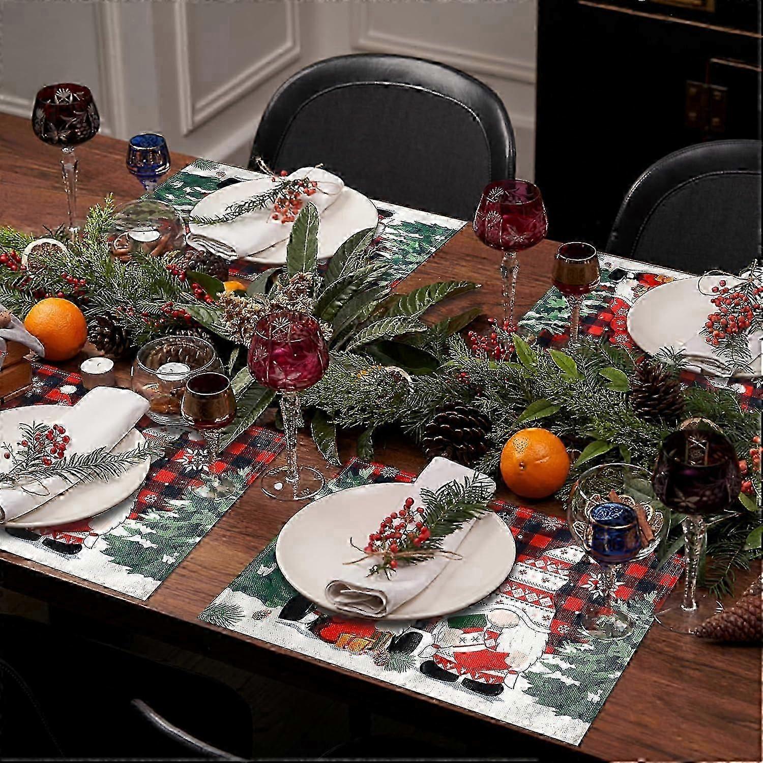 Crafted for Celebrations: Elevate your Christmas table setting with our farmhouse Christmas placemast set of 4. Made from responsibly sourced Cotton Linen, it offers a soft, premium touch and stands as an durable & reusable holiday placemats choice for those who value durability.Ultimate Protection with Style: This captivating rustic Christmas table mats not only beautifies your festive setting but also shields your dining table from accidental spills or scratches during festive meals, making it an ideal Christmas table settings of celebrating occasions.Present-Worthy Design for Cherished Moments: Featuring delightful Christmas gnomes illustrations against a classic red & black buffalo plaid design, our place mats set encapsulates the holiday spirit. Perfect for gifting, it captures the essence of merry Christmas celebrations.Easy Clean & Maintenance: No need to worry about spills and stains during your holiday feasts. Our Christmas placemats are easy to clean, ensuring that your festive setup remains impeccable. Our placemats are machine-washable and suitable for ironing, ensuring a smooth Christmas table setting after every festive occasion.Premium Cotton Linen for Lasting Durability: Our winter placemats boasts exquisitely detailed and vibrant printing. Made from high-quality, durable Cotton Linen, it's designed to endure frequent festivities. Whether celebrating your first holiday season or reliving cherished traditions year after year, it retains its enchanting allure and robustness.Perfect Size for Holiday Gatherings: Each placemat in our Christmas table mats set of 4 is generously sized to accommodate all your festive dishes. Whether you're hosting a grand meal or a cozy family dinner, these placemats are the ideal choice for indoor gatherings, adding a touch of warmth and joy.Vibrancy that Endures with Fade Resistance: Our red plaid Christmas placemats is designed to resist fading over time, ensuring your festive decor remains radiant wash after wash. Celebrate with a table runner that retains its charm and color every holiday season.
