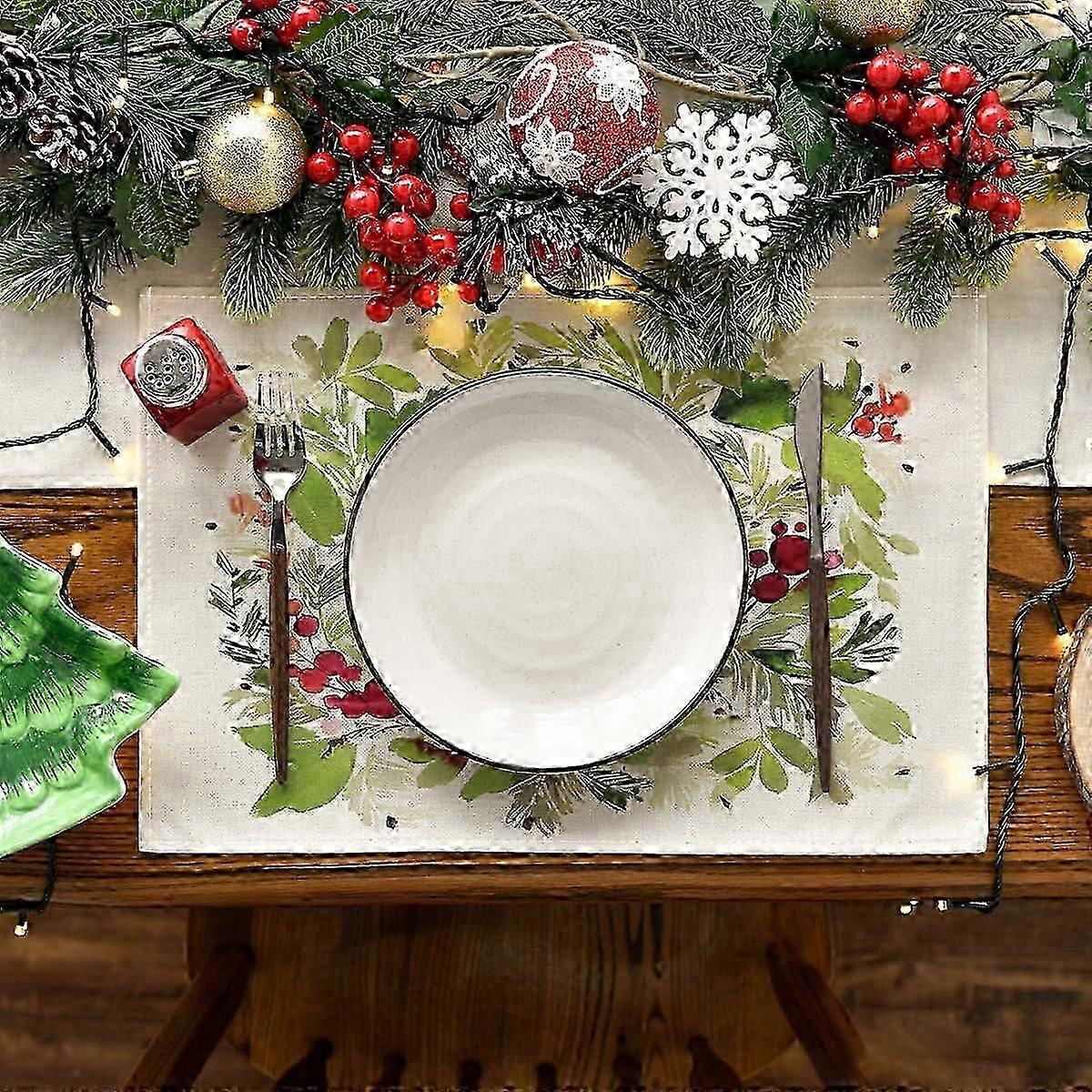 Set of 4 Watercolor Holly Christmas Placemats , 12x18 Inch Seasonal Winter Xmas Holiday Table Mats for Party Kitchen Dining Decoration