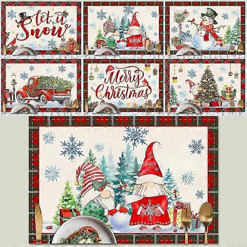 Christmas Table Decoration: 6 Christmas placemats, 6 Christmas patterns, rectangular, size 32 x 45 cm.Material: The Christmas table mat is made of linen, with folded and reinforced edges, not easy to break, heat-resistant, bright colors and clear patterns.Easy to clean: The Christmas placemats are washable, not easy to fade, and can be reused after simple cleaning.Application: The Christmas placemats can be used as table decorations during the Christmas season, creating a rich Christmas atmosphere.