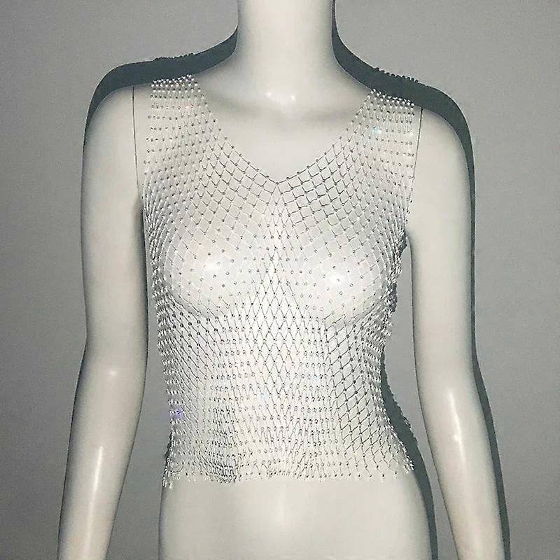 Sexy Rhinestone Fishnet Y2k See-through Crop Top Beach Cover Up Party Nightclub