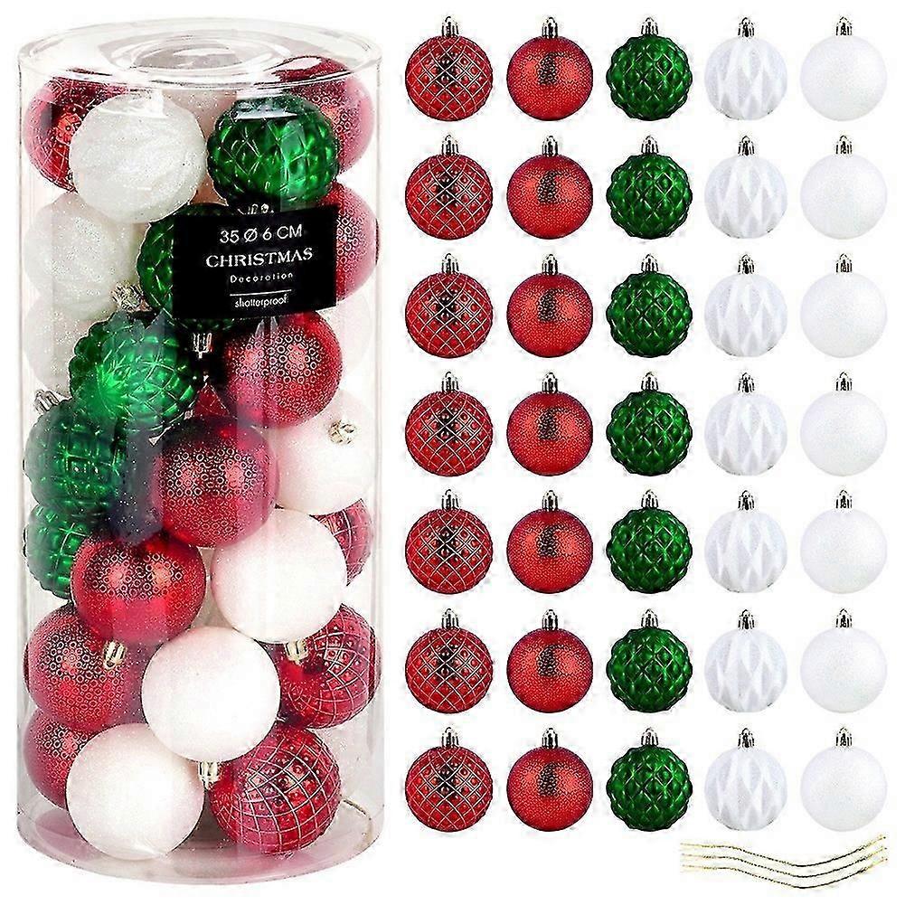 Set of 35 decorative Christmas tree ornaments in red, green and glittery white. These shatterproof ornaments are perfect for creating a festive atmosphere.
