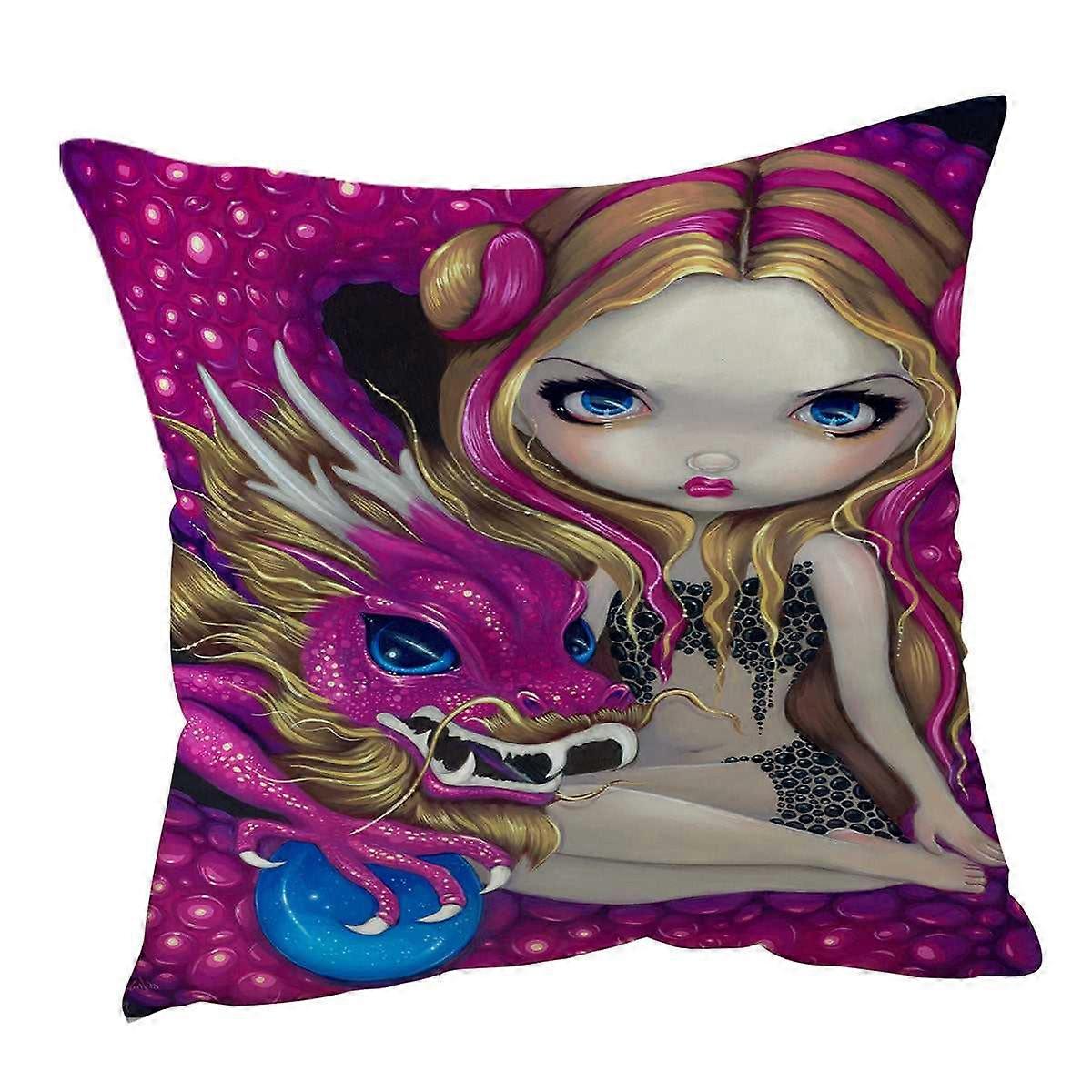 Shimmering Pink Dragon and Beautiful Big Eyed Girl Cushion Cover