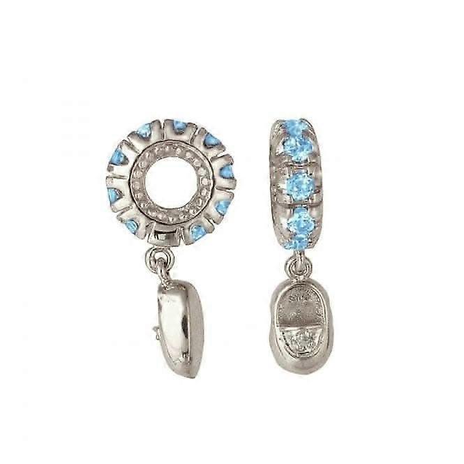 Storywheels Silver & Swiss Blue Topaz Baby Shoe Dangle Charm S104SW This beautiful Storywheels charm in 925 sterling silver is set with nine round cut Swiss Blue Topaz gemstones. The main feature is the diamond set baby shoe dangle. The perfect keepsake for any mother. - 925 Sterling Silver - Diamond Stones - 9 Real Swiss Blue Topaz Gemstones This item comes with original Storywheels packaging.