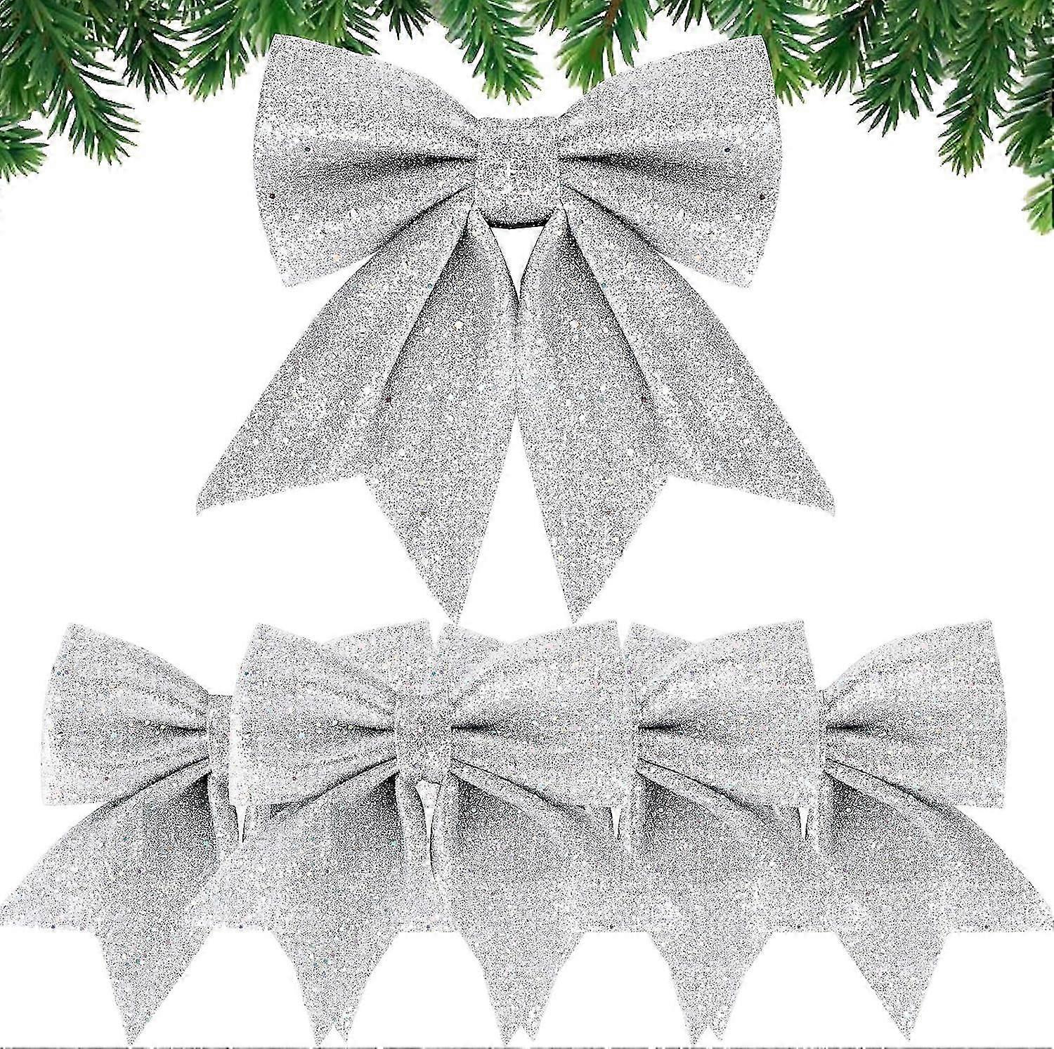(Silver)5PCS Christmas Ribbon Bow 24cm Large Size Christmas Bows Ribbon Bowknots Ornaments Christmas Decoration for Christmas Trees Gift Wrapping Chri