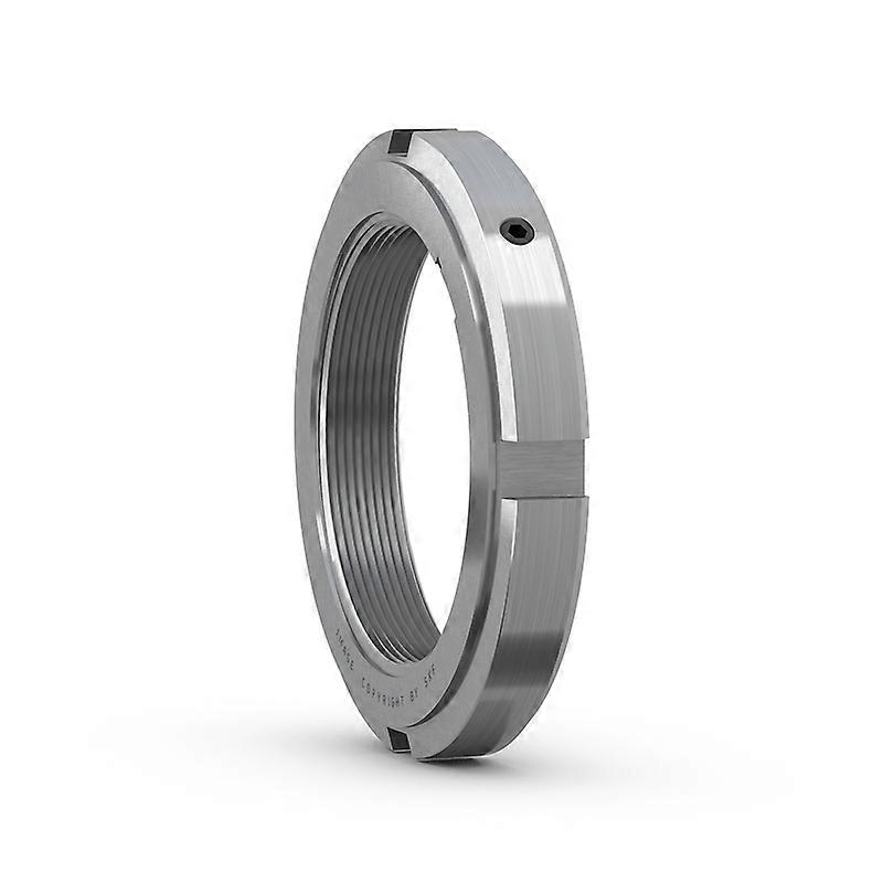 Lock nuts are used to locate bearings onto a shaft. Additionally, they can be used to mount bearings with a tapered bore onto tapered shaft seats and adapter sleeves, and to dismount bearings from withdrawal sleeves. They are frequently used to secure gears, belt pulleys and other machine components. Lock nuts have to be secured to prevent unintentional loosening, by either a locking device that engages a keyway in the shaft or key slot in the adapter sleeve, or a locking mechanism integrated in the nut. KM lock nuts, also known as shaft or withdrawal nuts, are designed to be used with lock washers. They feature four equally spaces slots located around their circumference to accommodate a hook or impact spanner. Lock Nut Features Simple, stable and reliable fastening element. Wide range of sizes. Easy to mount and dismount. Product Data Dimension Standards: ISO 2982-2. Tolerances: Metric Thread, 5H: ISO 965-3. Mating Shaft Threads (Recommendation): ISO 965-3.