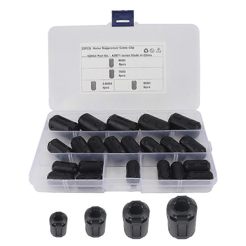 22x Ferrite Core Clip Ring Kit Noise Silencer Filters Cable Connector Terminal 3.5mm/5mm/7mm/9mmFeature:1. Zinc ferrite. It can improve the electromagnetic field around the electromagnet, thus avoiding external interference.2. Easy to install, easy to use, can be disassembled, and there is a flexible clip on the port.3. Good performance, high efficiency and long service life. Placing it near an electromagnetic source can improve the quality of the audio and video signal more effectively.4. The cable clip will not distort the transmission signal or affect the quality of audio, video, and photos.5. Application: used for all kinds of electronic jumper wires, wire harnesses, home appliances, air conditioners, computers, inverters, electric welding, power cords, etc. (Note: When the wire is too thin, you can wind a few more turns on the magnetic ring to create a relaxation effect.)Specification:Material: ferrite ni-znInner Diameter: 3.5mm/5mm/7mm/9mmIntroduction:(1)3.5mm/0.14in (Inner Diameter): suitable for 0.06-0.14in/1.5-3.5mm cablesApplication: Car DVR, Headphone Cable, Speaker Cable, Mouse Cable, Keyboard Cable, USB Cable, etc. (2) 5mm / 0.2in (inner diameter): suitable for 0.14-0.2in / 3.5-5mm cablesApplication: car DVR, speaker cable, mouse cable, keyboard cable, USB cable, RS232 serial port camera cable, etc. (3) 7mm / 0.27in (inner diameter): suitable for 0.2-0.27in / 5-7mm cables Application: AV cable, coaxial audio, sound power wire, IP serial camera, etc. (4) 9mm / 0.35in (inner diameter): suitable for 0.27-0.35in / 7-9mm cablesApplication: HDMI compatible cable, VGA cable, DVI cable, power cord, speaker cable, industrial wire, etc. Color: BlackUsage:(1) Signal line clamp to play the role of anti-interference and electromagnetic compatibility. (2) Tighten the power cord to stabilize the current and improve the sound quality. Note:Due to the different monitor and light effect, the actual color of the item may be slightly different from the color showed on the pictures. Please allow 1-3mm measuring deviation due to manual measurement. 4X3.5mm Ferrite Rings5X5mm Ferrite Rings8X7mm Ferrite Rings5X9mm Ferrite Rings