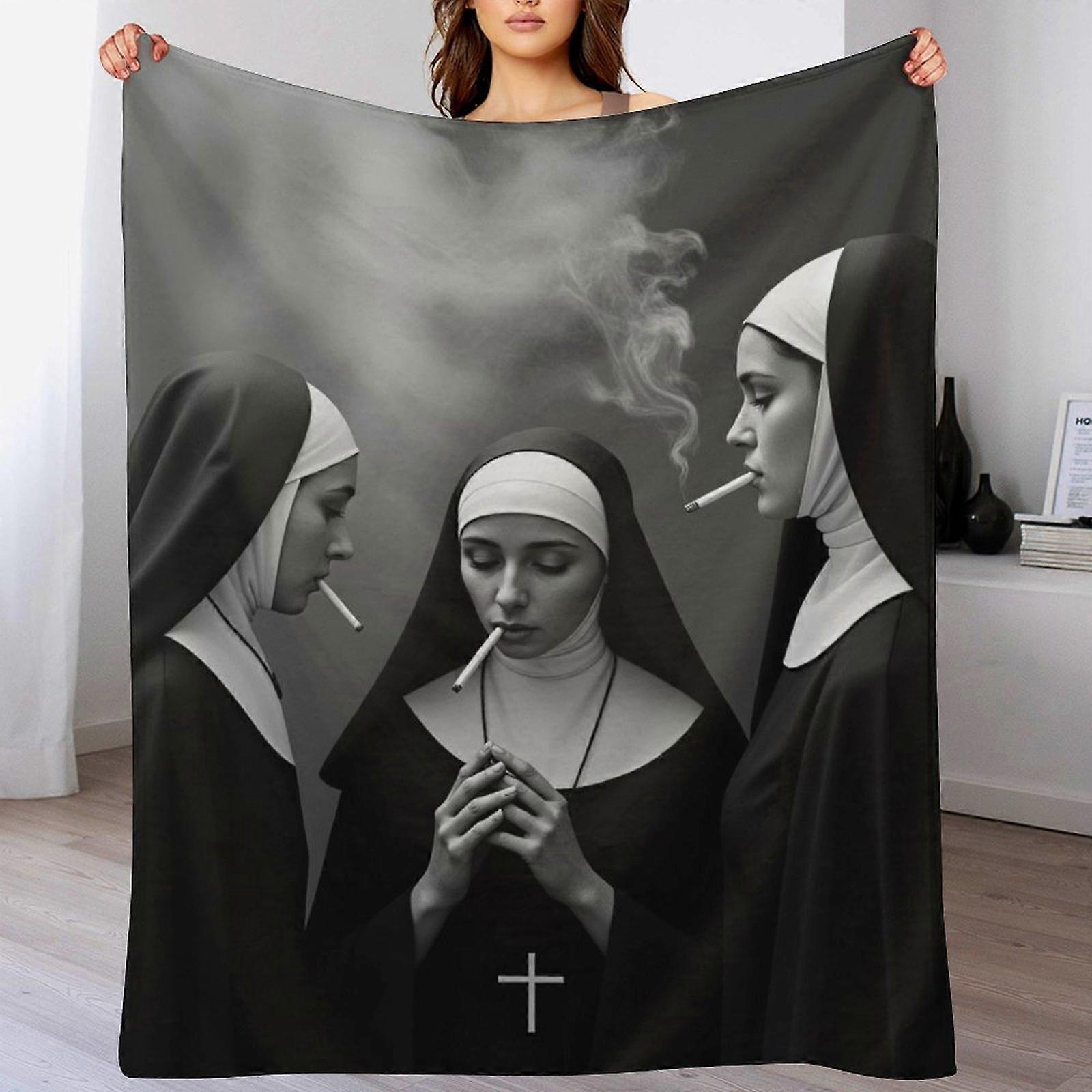 Smoking Nuns Art Print Flannel Blanket - Soft Warm Throw | Provocative Decor for Alternative Style Fans