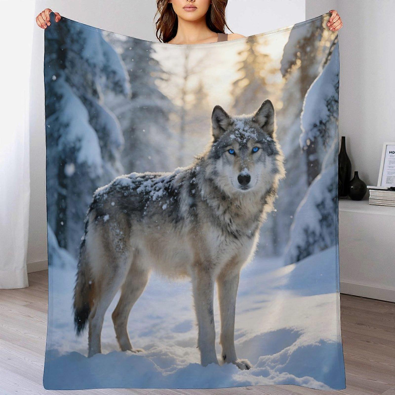 Snowy Blue-Eyed Wolf Print Flannel Blanket - Cozy Warm Throw for Living Room | Nature Animal Decor for Outdoor Enthusiasts