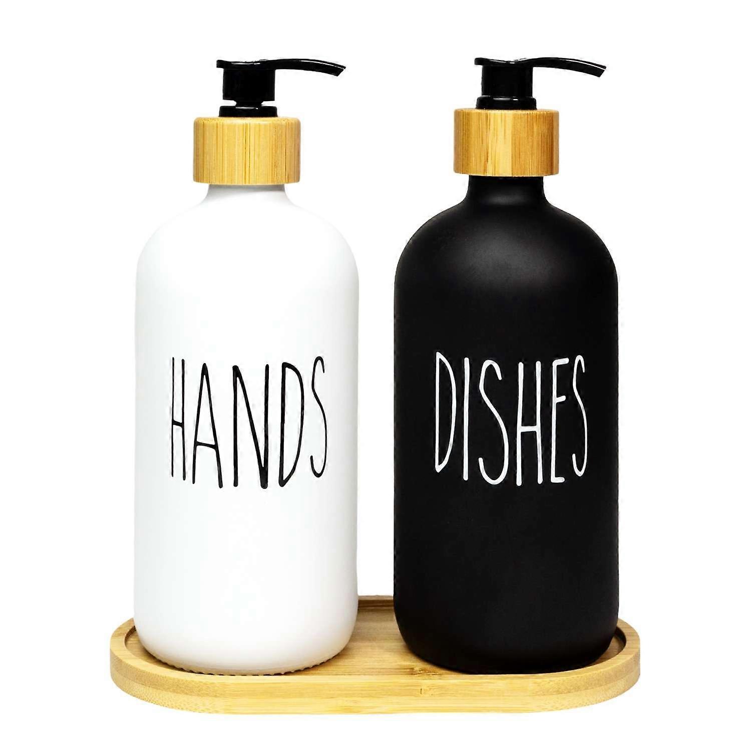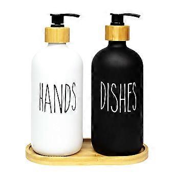 Seifenspender 3-teiliges Set aus Glas in Weiß mit Bambus Tablett - 500 ml - 17.5 x 8.8 x 20.6 cm