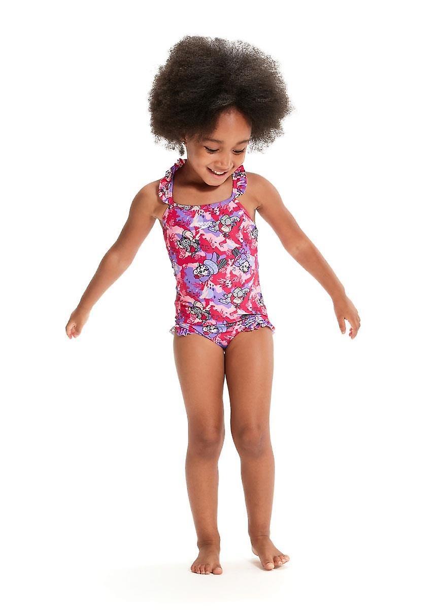 Speedo Girls Learn to Swim Printed Frill Thinstrap Swimsuit - Cherry Pink/Sweet Taro/Hellium - Girls