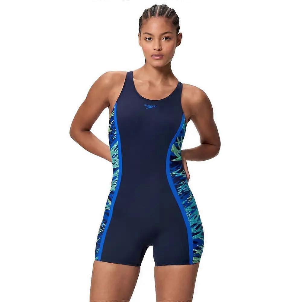 FEATURES Chlorine Resistant Front Lined Full Coverage Comfort underbust elastic for support Muscleback Endurance Pro - All the performance credentials of Endurance+, constructed from 100% recycled yarns. Four-way stretch fabric designed for durability with chlorine and pilling resistance. Body made of 57% recycled polyester, 43% recycled PBT Built for serious swimmers, this Speedo Hyperboom Splice Muscleback Legsuit in navy, combines performance with sustainability. The Endurance Pro fabric delivers exceptional chlorine resistance and resists pilling, ensuring your suit maintains its integrity through countless training sessions. Four-way stretch technology works seamlessly with the muscleback cut to maximise shoulder mobility and streamline your stroke. A supportive underbust elastic provides subtle compression without restriction, while the legsuit silhouette offers complete coverage for lap work. Crafted from 57% recycled polyester and 43% recycled PBT, this navy design with striking blue graphics represents a commitment to both athletic excellence and environmental responsibility.