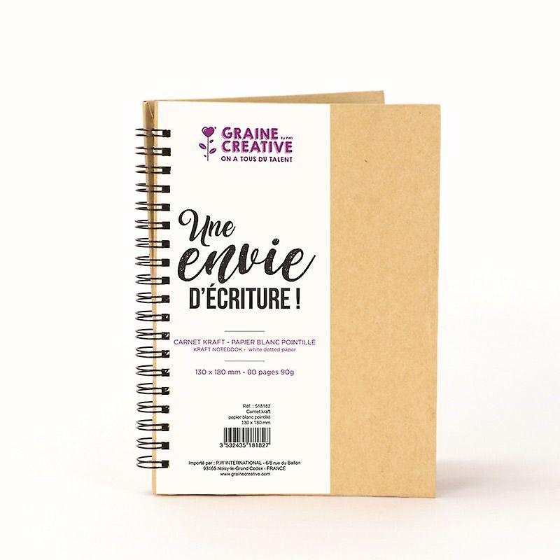 With this 80-page notebook, write down and record all your thoughts and ideas on white dotted paper. Spiral kraft notebook size 18 x 13 cm.
