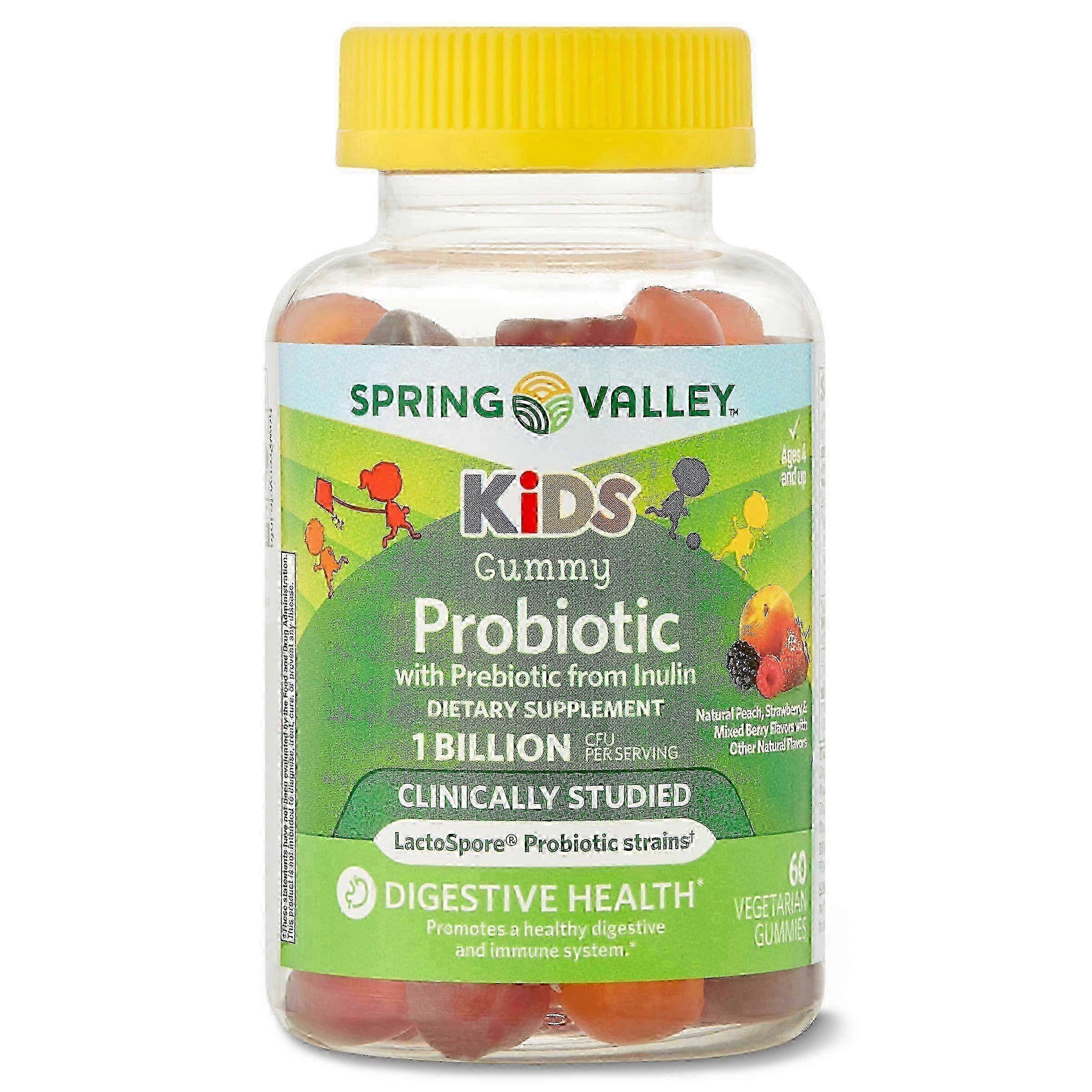 This product has a risk that it could melt during shipping by ground services due to the warm weather, especially during the summer months from May through August. We would suggest you to choose any expedited or express carrier service available during those summer months, however, this still does not guarantee that it will not melt. Spring Valley Kids' Probiotic + Prebiotic Vegetarian Gummies, 60 Count are the simplest, best-tasting way to promote your little oneâs digestive health and support a healthy immune system. With flavors like peach, strawberry, and mixed berry. Our delicious and easy to chew gummies make taking your daily probiotic a joy. Spring Valley understands living a healthy, balanced lifestyle is the key to being your best self. With a commitment to using only the highest quality ingredients, Spring Valley gummies are a simple and delicious addition to your daily routine that you can feel good about. Our affordable range of high-quality products supports you and your family's health and holistic wellbeing. Spring Valley Kidsâ Probiotic + Prebiotic Vegetarian Gummies contain the clinically studied ingredients lactospore and inulin and have been specifically formulated to meet your childâs health needs.These probiotic gummies are packed full of good stuff. Spring Valley Kids' Probiotic + Prebiotic Vegetarian Gummies, 60 Count 1 Billion CFU per serving LactoSpore Probiotic Strains Prebiotic from Inulin Promotes a healthy digestive system Promotes a healthy immune system Clinically studied probiotic strains Formulated specifically for kids