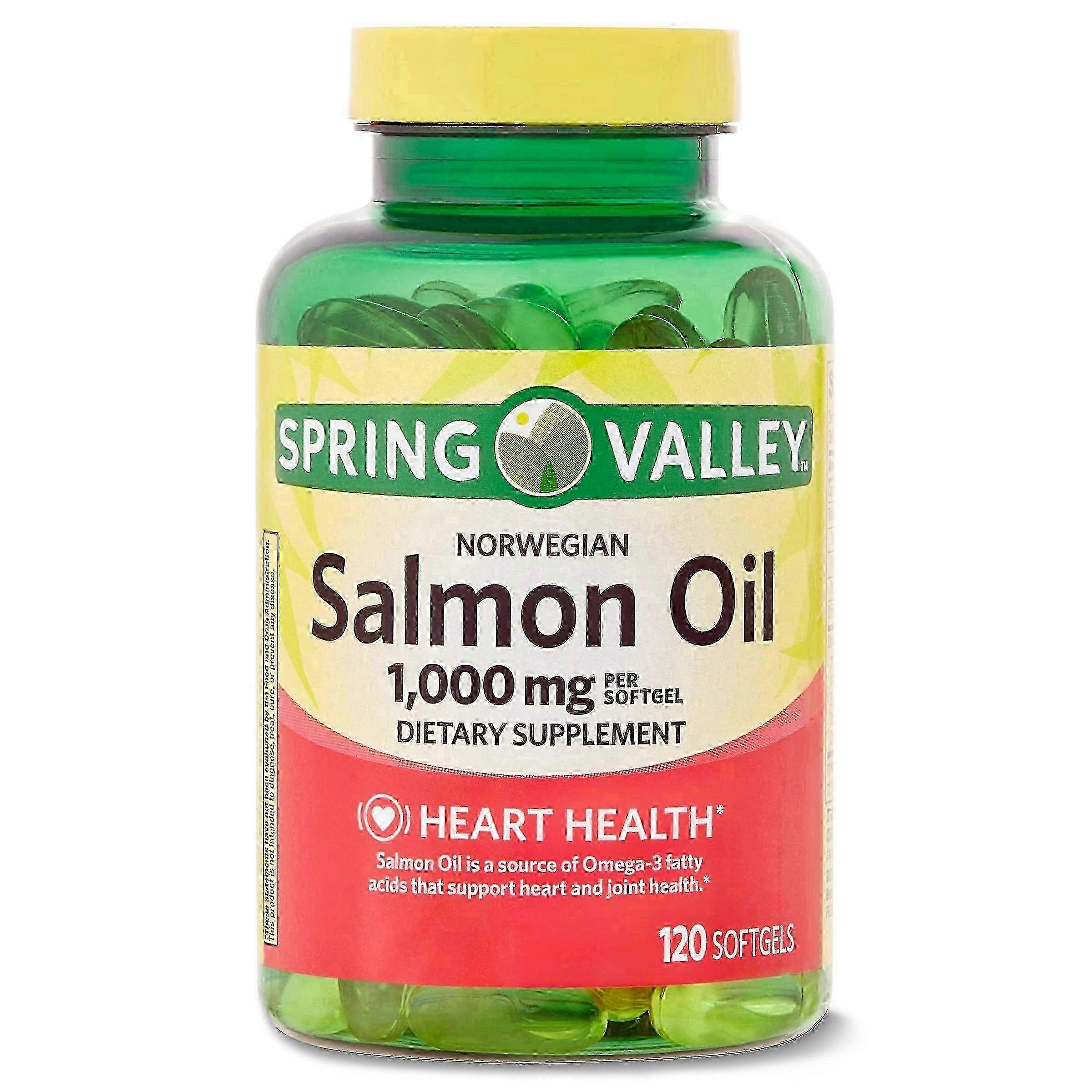 Spring Valley Norwegian Salmon Dietary Supplement, 1,000 mg contains salmon oil, a source of omega-3 fatty acids that supports heart and joint health. These softgels contain no gluten, yeast, wheat, milk or milk derivatives, lactose, sugar, preservatives, soy, artificial color, artificial flavor, or chemical solvents, and contains less than 5 milligrams of sodium per serving. The recommended dosage is 2 softgels twice daily, preferably with a meal. You can rest assured that our Spring Valley Norwegian Salmon Dietary Supplement, 1,000 mg is produced with strict quality guidelines and backed by our quality control. Suggested Use: Suggested Use: Adults, take two softgels twice daily, preferably with a meal. Expiration Date: We have fresh stock each week with exceptional expiration dates prior to JANUARY 2024. Products will expire no later than six months to 1 year after receipt. Product Packaging: Please note that some manufacturer may often change their packaging. This product may arrive different from what is pictured. We will always ship the most up-to-date packaging to our customers. Please contact us if you have any questions about this product or would like to request an older version of this product. Healthcare Disclaimer: Content on this site is for reference purposes only. does not represent or warrant that the nutrition, ingredient, allergen and other product information on our Web or Mobile sites are accurate or complete, since this information comes from the product manufacturers. On occasion, manufacturers may improve or change their product formulas and update their labels. We recommend that you do not rely solely on the information presented on our Web or Mobile sites and that you review the product's label or contact the manufacturer directly if you have specific product concerns or questions. If you have specific healthcare concerns or questions about the products displayed, please contact your licensed healthcare professional for advice or answers.