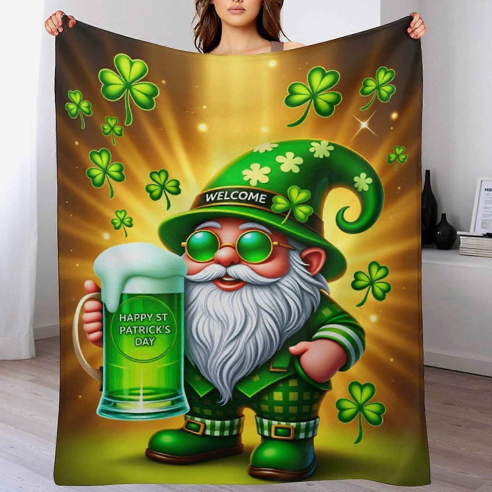 St. Patrick's Day Gnome & Green Beer Print Flannel Blanket - Soft Warm Throw for Living Room | Festive Gift for Holiday Celebrators