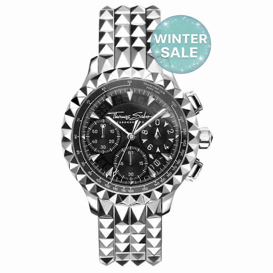 Thomas Sabo Stainless Steel Dial Black Statement Mens Watch WA0358-201-203 Black and silver men's watch: The THOMAS SABO statement chronograph impresses with its rebel aesthetic. The indices on the dial, bezel, crown and pusher of the case, the detailed stainless steel bracelet with its pyramid look and the unmistakable THOMAS SABO DNA are sure to draw everyone's eyes on the wrist. The functionality of the high quality Miyota quartz movement appeals not only to technology lovers: The counters offer a super-runner function which can measure hundredths of a second. In the tradition of a chronograph, the model also has a tachymeter scale that can be used to measure speed. Further highlight: The numbers on the date display are fully visible thanks to the integrated, slightly transparent acetate glass which acts as a sporty style element. The bracelet can be adapted to the wearer's wrist by removing individual elements. Thomas Sabo Jewellery will come complete with matching packaging (*packaging images are for demonstration purposes - may vary from images shown) N.B. DUE TO OFFER PRICES OFFER ITEMS DO NOT COME WITH FULL PACKAGING - POUCHES ONLYPlease let us know if you need any further packaging in the notes section at checkout where our customer service team will be happy to help.Discover the world of Acotis Diamonds, where exceptional craftsmanship and timeless elegance come together to create jewellery designed to be treasured for a lifetime. Every piece in our collection is thoughtfully curated and masterfully finished, reflecting our commitment to quality, artistry, and enduring style. From radiant diamonds to lustrous precious metals and contemporary designer creations, Acotis Diamonds offers jewellery that celebrates individuality, sophistication, and the beauty of fine detail. Our range is crafted using only the finest materials, ensuring every item meets the highest standards of brilliance and durability. Whether it’s the sparkle of meticulously cut diamonds, the rich sheen of gold and sterling silver, or the vibrant hues of carefully selected gemstones, each piece is chosen to deliver exceptional clarity and lasting allure. We partner with leading jewellery designers and trusted global brands to bring you collections that blend modern aesthetics with classic inspirations, offering something to suit every personality and occasion.At Acotis Diamonds, we believe jewellery should be as meaningful as it is beautiful. That’s why we focus on craftsmanship that captures life’s most precious moments—whether it’s a gift to mark a milestone, a token of affection, or a personal investment in everyday luxury. Our designers pay close attention to every curve, facet, and setting, ensuring unmatched comfort, balance, and visual appeal. Each piece undergoes rigorous quality checks, so you can feel confident that your jewellery is made to endure, shine, and be cherished for years to come. From elegant bracelets and necklaces to statement earrings, refined rings, and collectible charms, our diverse range allows you to express your style with effortless sophistication. Whether you prefer understated minimalism, bold contemporary design, or timeless traditional beauty, Acotis Diamonds provides jewellery that enhances every moment with subtle glamour and refined detail. Experience the artistry of fine jewellery with Acotis Diamonds—where superior craftsmanship, exceptional quality, and thoughtful design come together to create pieces that truly shine.