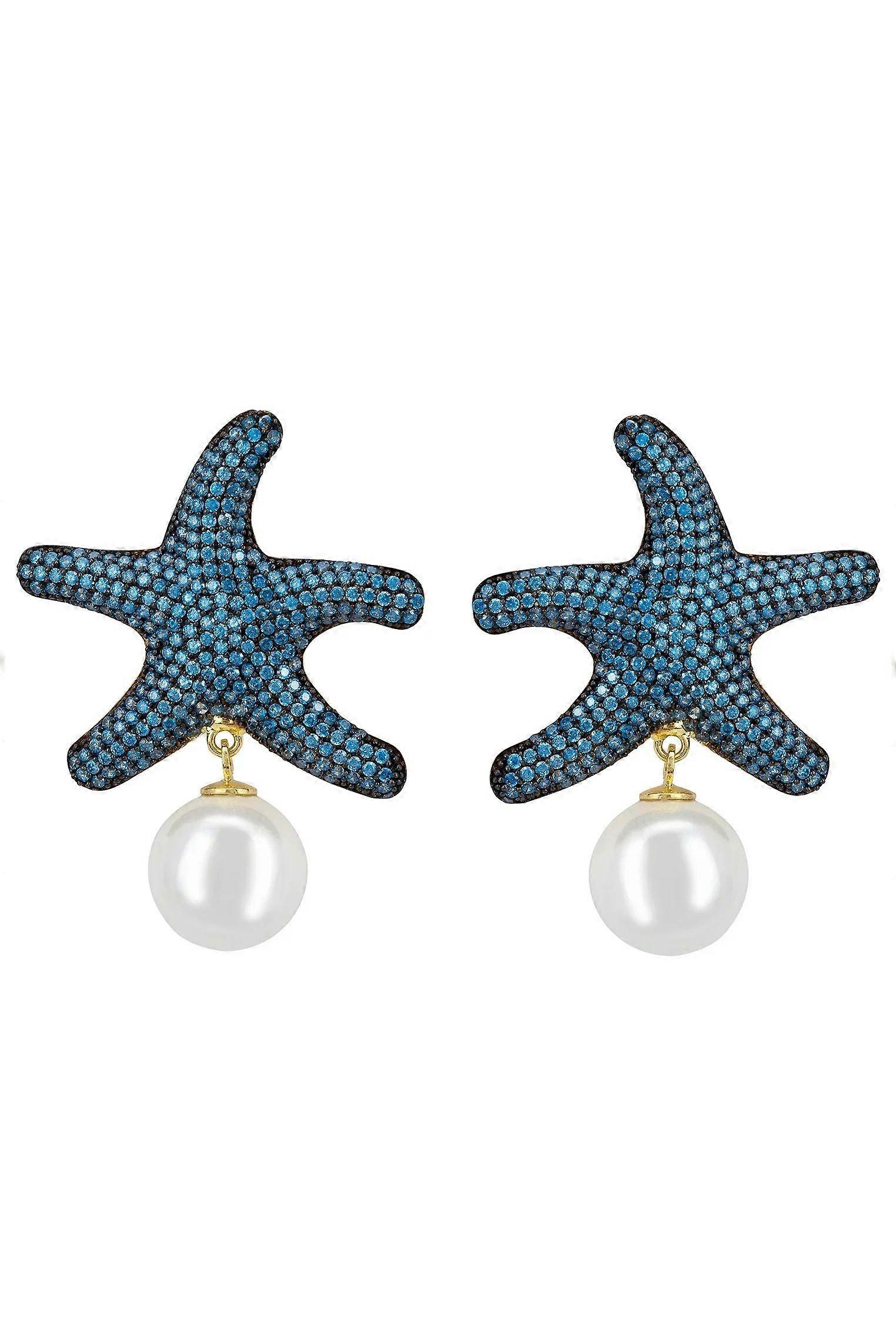 Starfish Pearl Drop Earrings by Latelita - 925 Sterling Silver with Blue Topaz and Pave Set Zircons, Post and Butterfly Fastening - Gold, Female