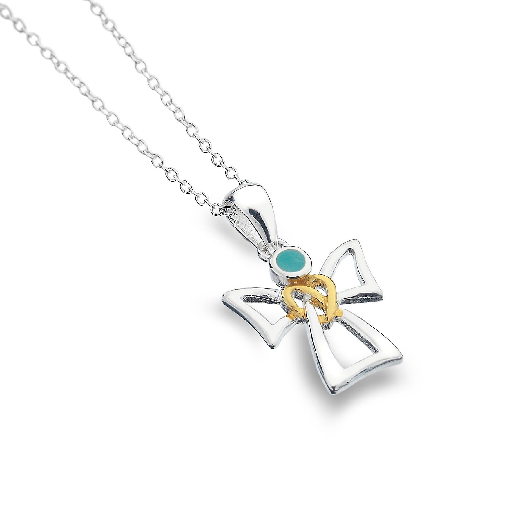 Sterling Silver Pendant Necklace - Celtic Angel + Gold Plated + Synthetic / Turquoise