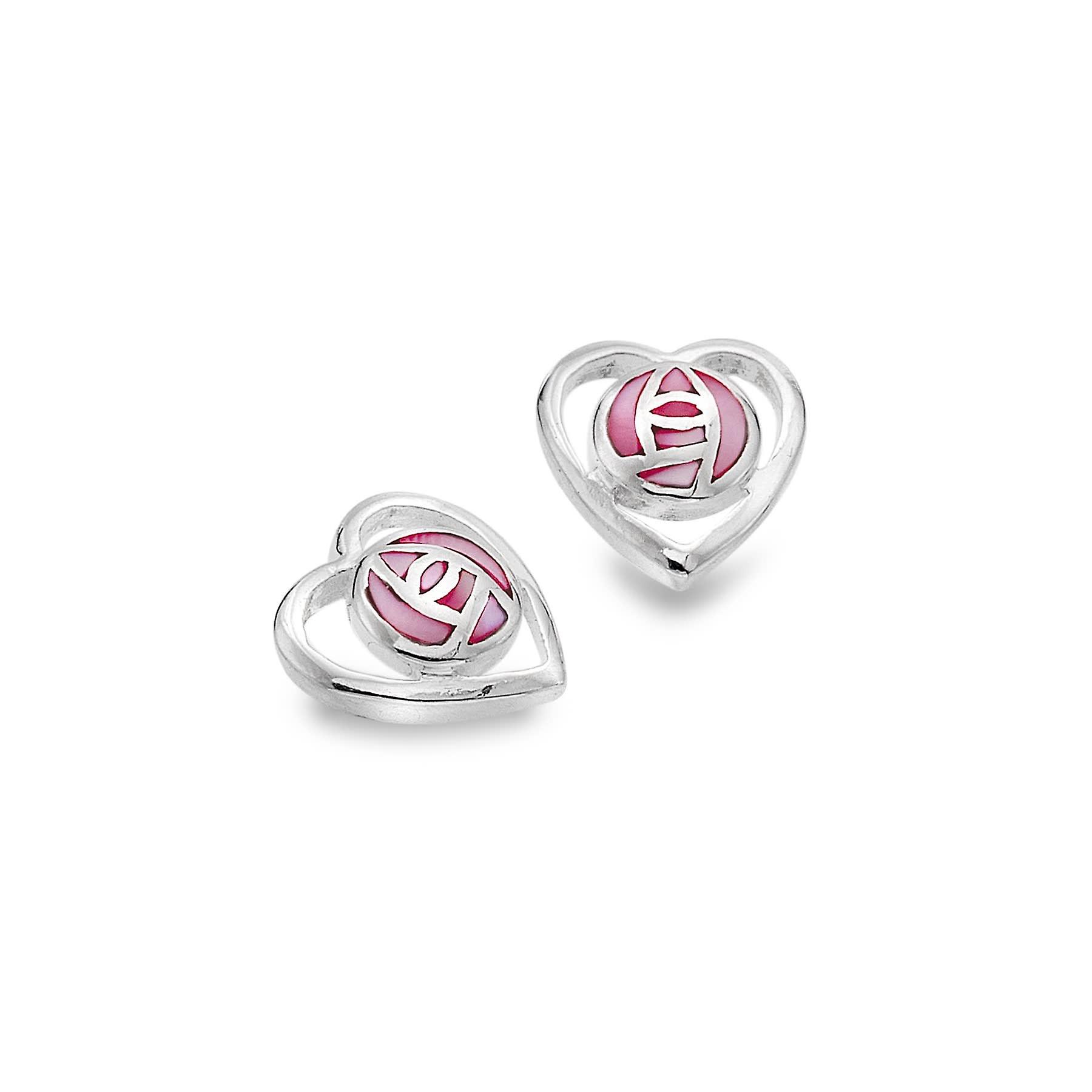 Sterling Silver Stud Earrings - Charles Rennie Mackintosh Heart + Rose + Pink Mother of Pearl