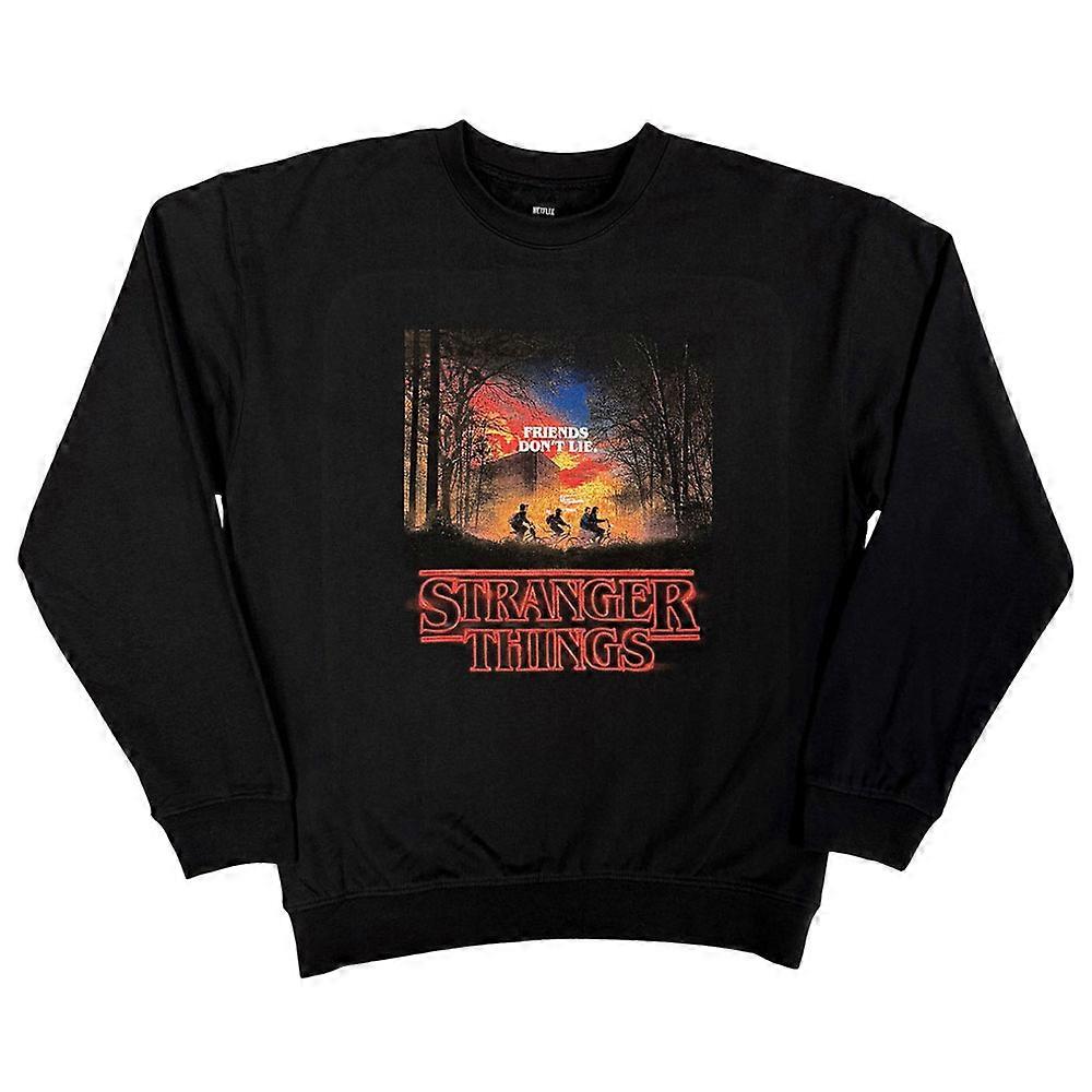 An official licensed Netflix Sweatshirt featuring the Stranger Things - Friends Don�t Lie design motif. This high quality T-Shirt is available in a black colourway. Comes in a wide range of sizes from Small through XX-Large, subject to availability.