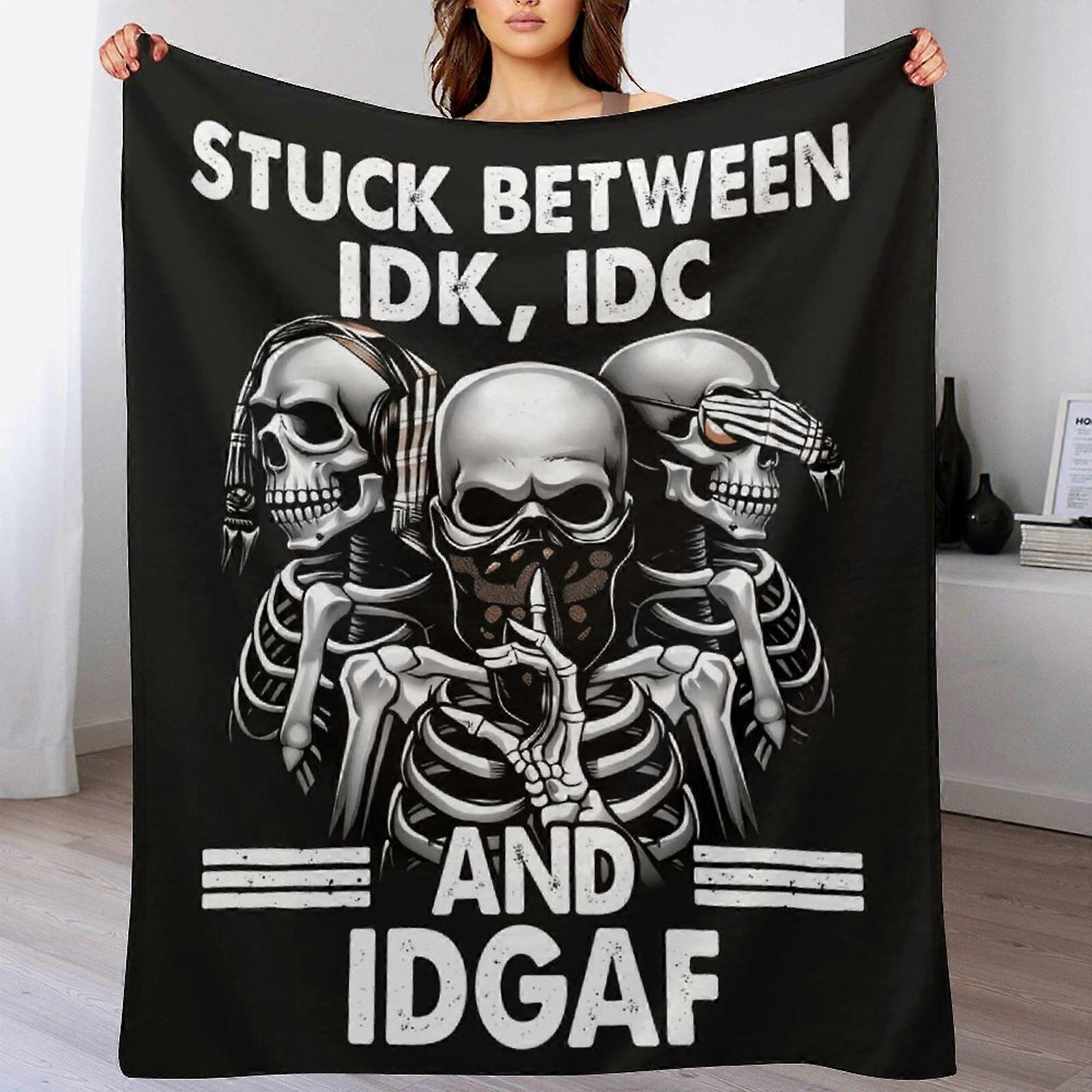 "Stuck Between IDK, IDC, IDGAF" Skeleton Print Flannel Blanket - Cozy Warm Throw | Edgy Humorous Gift for Teens & Young Adults