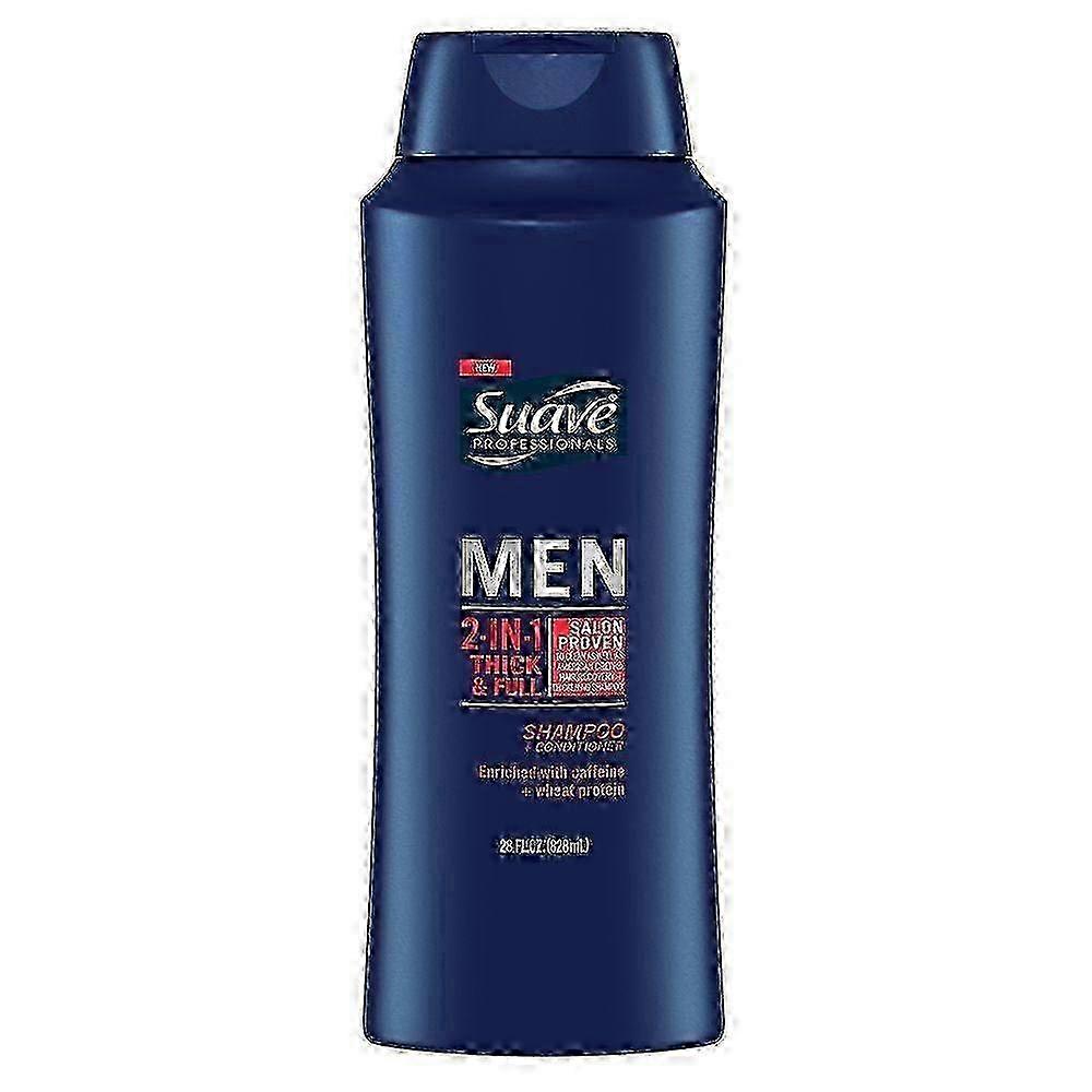 Suave Men Thick Full 2 in 1 Clean Shampoo and Conditioner has an advanced formula, to clean and condition hair in just one step. Designed specifically for the needs of men, this thickening shampoo contains caffeine and wheat protein. Suave Men Thick Full 2 in 1 Clean Shampoo and Conditioner is salon proven to work as well as American Crew Hair Recovery Thickening Shampoo. With Suave Men, you can experience a salon-quality product at a great price. Suave Men is range of products made specifically for men’s hair. For dandruff, also try the Pure Power Anti-Dandruff Shampoo and Conditioner option, or try Suave Men Styling Gel or Paste to keep your hair style in place. Suave Men has a range of products that can help you smell good and feel good. Visit our site to explore more products from Suave Men: http://www.suave.com/product/category/662002/menhair-care About Suave For over 75 years Suave has offered professional quality products for the entire family, which are proven to work as well as salon brands. The Suave mission is to make gold standard quality attainable to all, so everyone can look good, smell good, and feel good every day.(American Crew is a registered trademark of Beautyge Brands USA, INC.)Suave Men 2 in 1 Shampoo and Conditioner Thick Full 28 oz Suave Men Thick Full 2in1 shampoo and conditioner is an invigorating thickening shampoo made specifically for men's hair Hardworking, lightweight formula that rinses clean without leaving build-up or weighing hair down Salon proven to work as well as American Crew Hair Recovery Thickening Shampoo Enriched with Caffeine Wheat Protein, leaves hair looking clean and healthy Cleans and conditions in one easy step Features a fresh and clean scent