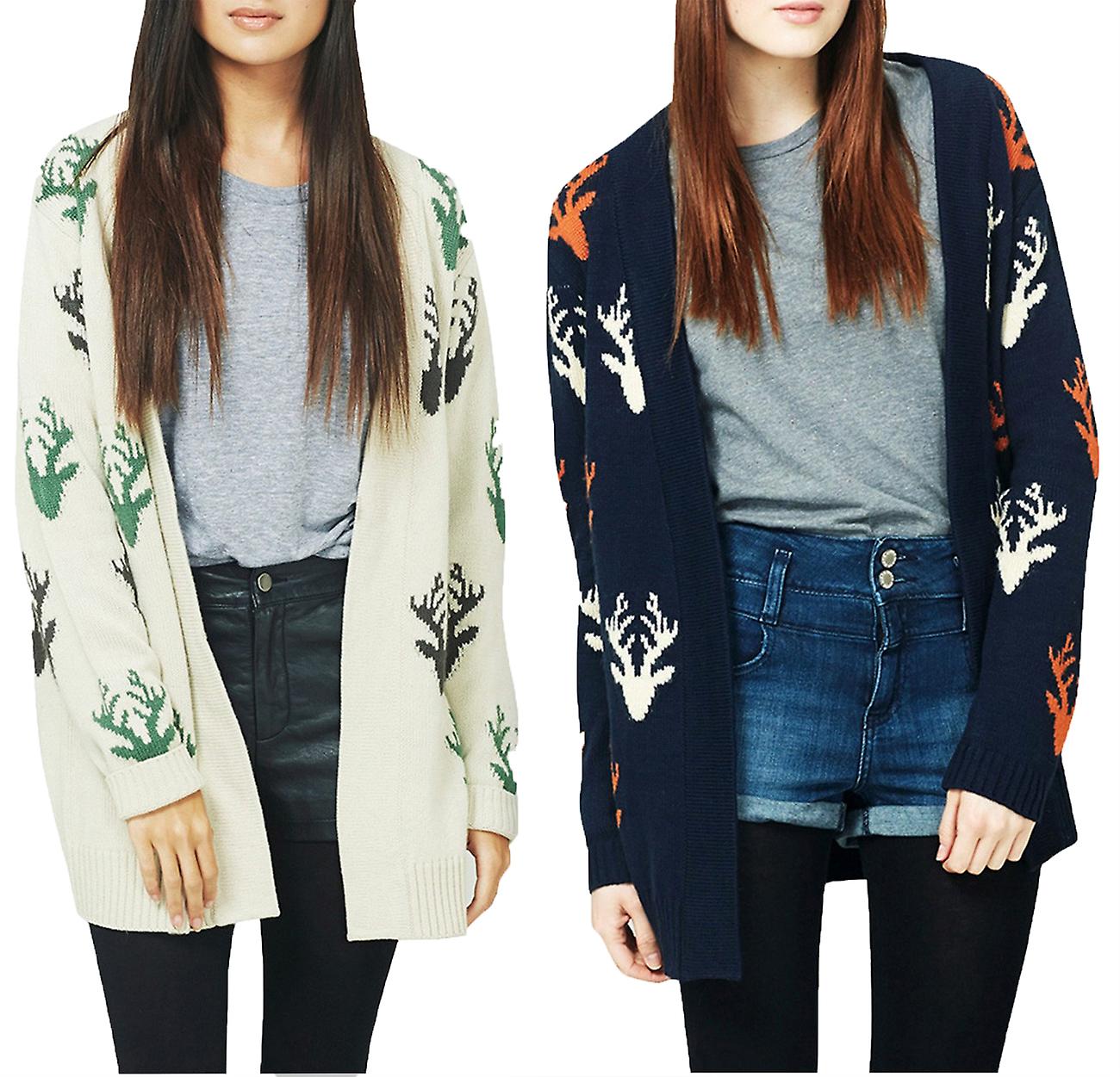 This cardigan is perfect for winter- in a chunky warm knit with retro stag design. The blue cardigan has cream and burnt coral stags, while the cream background has charcoal and green. It does not have buttons, but you can fasten with a safety pin or brooch if required.