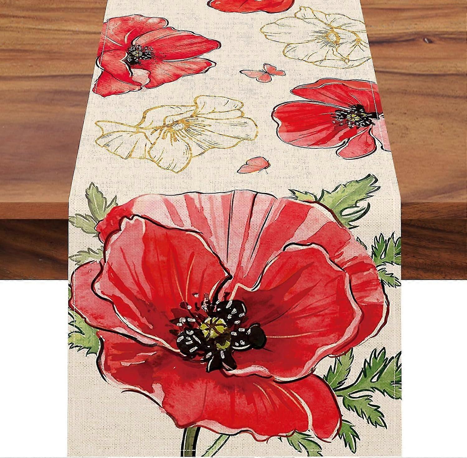 Summer Poppy Flower Table Runner, Red Gold Floral Butterfly Kitchen Dining Table Decoration, Season