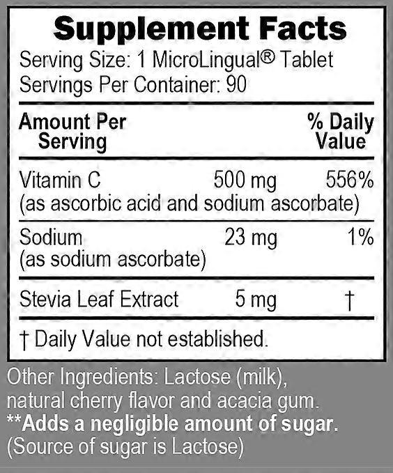 Description Vitamin C is an essential nutrient that cannot be produced by the body, therefore, it must be replenished daily. Vitamin C has several beneficial purposes including developing and maintaining healthy skin and bones, to form collagen and also enhances the absorption of iron from plant-based foods we eat. Vitamin C also provides support to the body’s immune system.* “Superior Source” Vitamin C 500 mg, “Sour Cherry Melts”, utilizes sodium ascorbate, which is a buffered (non-acidic) form of C that does not contribute to gastric irritation. Although each MicroLingual® tablet contains very little sodium (only 1% of the Daily Requirement), it is helpful in offsetting the natural acidity of Vitamin C, creating a smoother less acidic taste. As sodium ascorbate is a fully reacted, truly buffered form of vitamin C, it has a high degree of tissue compatibility. Additionally, it is the preferred form for intravenous infusion. The sodium in this product differs from common table salt in that it is not combined with chloride like the “salt” most often associated with hypertension.* NO sugar added; only sweetened with a little stevia. This is preferable to most “chewable” vitamin C products that typically are loaded with lots of sugar. Directions: As a dietary supplement, dissolve one MicroLingual® tablet under the tongue daily. May also be swallowed as you would a regular tablet. *Disclaimer: These statements have not been evaluated by the Food and Drug Administration. These products are not intended to diagnose, treat, cure, or prevent any disease.